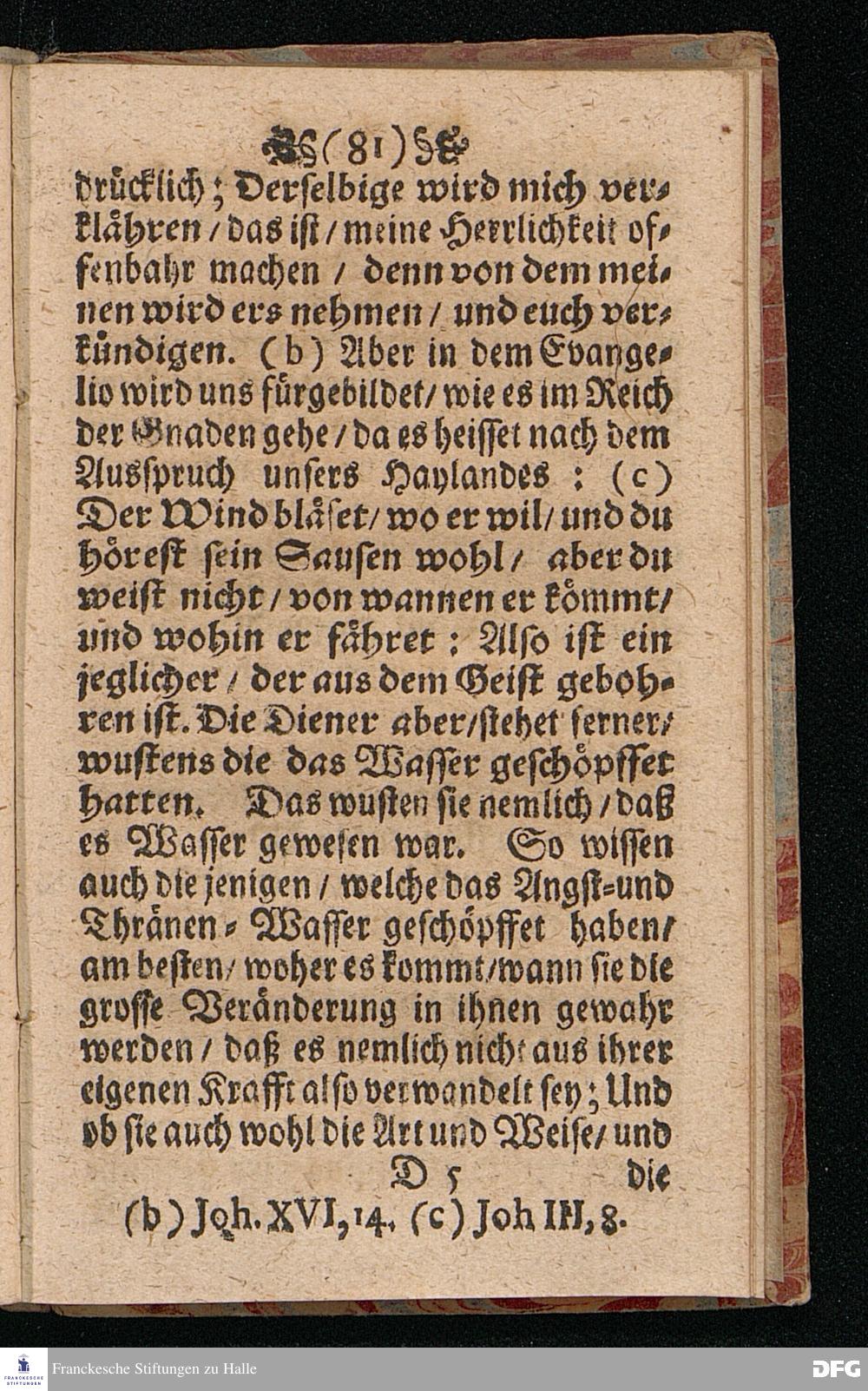 Quedlinburgisches Zeugniß / Oder Predigt Von der Offenbahrung der Herrlichkeit Christi / Uber das Evangelium Joh.II. v.1-11. Am II.Sont.nach Epiphan. In der Quedlinburgischen Schloß=Kirchen bey zufälliger Gelegenheit / auff geschehene Ansuchung abgeleget / Und in etwas erweitert zum Druck gegeben Von M.Aug.Hermann Francken Gr.& Or.Lingg.P.P.& P.Glauch. Hall[e] / Gedruckt und verlegt von Christoph Salfelden / Churfürstl.Brandenb.Hoff= und Regierungs Buchdrucker.