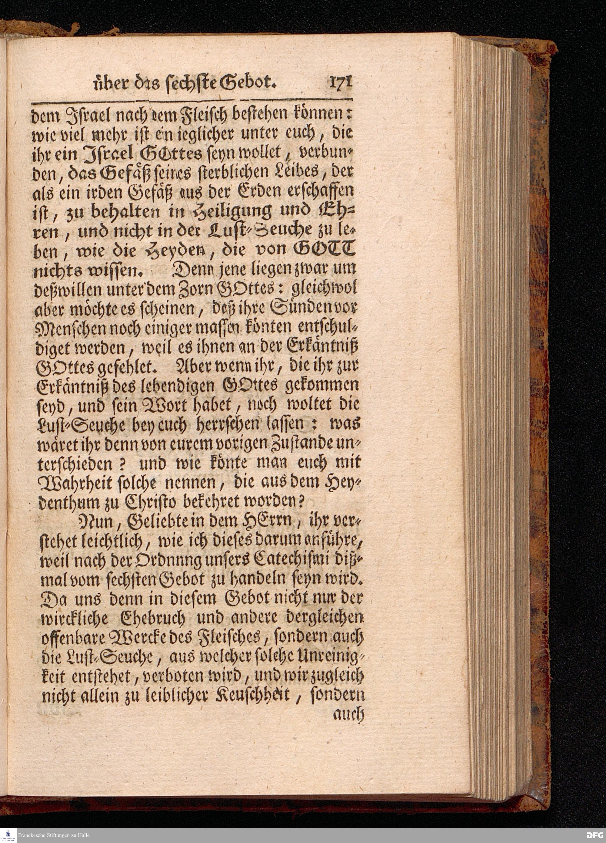 August Hermann Franckens / S.Th.Pr.Past.Vlr.& Schol. Catechismus = Predigten / Darinnen Die V.Hauptstücke des kleinen Catechismi Lutheri, zu gründlicher Erbauung im wahren thätigen Christenthum, abgehandelt sind, gehalten In der Kirche zur L.Frauen zu Halle / im Hertzogthum Magdeburg. Andere Auflage. HALLE, In Verlegung des Wäysenhauses, MDCCXXIX.