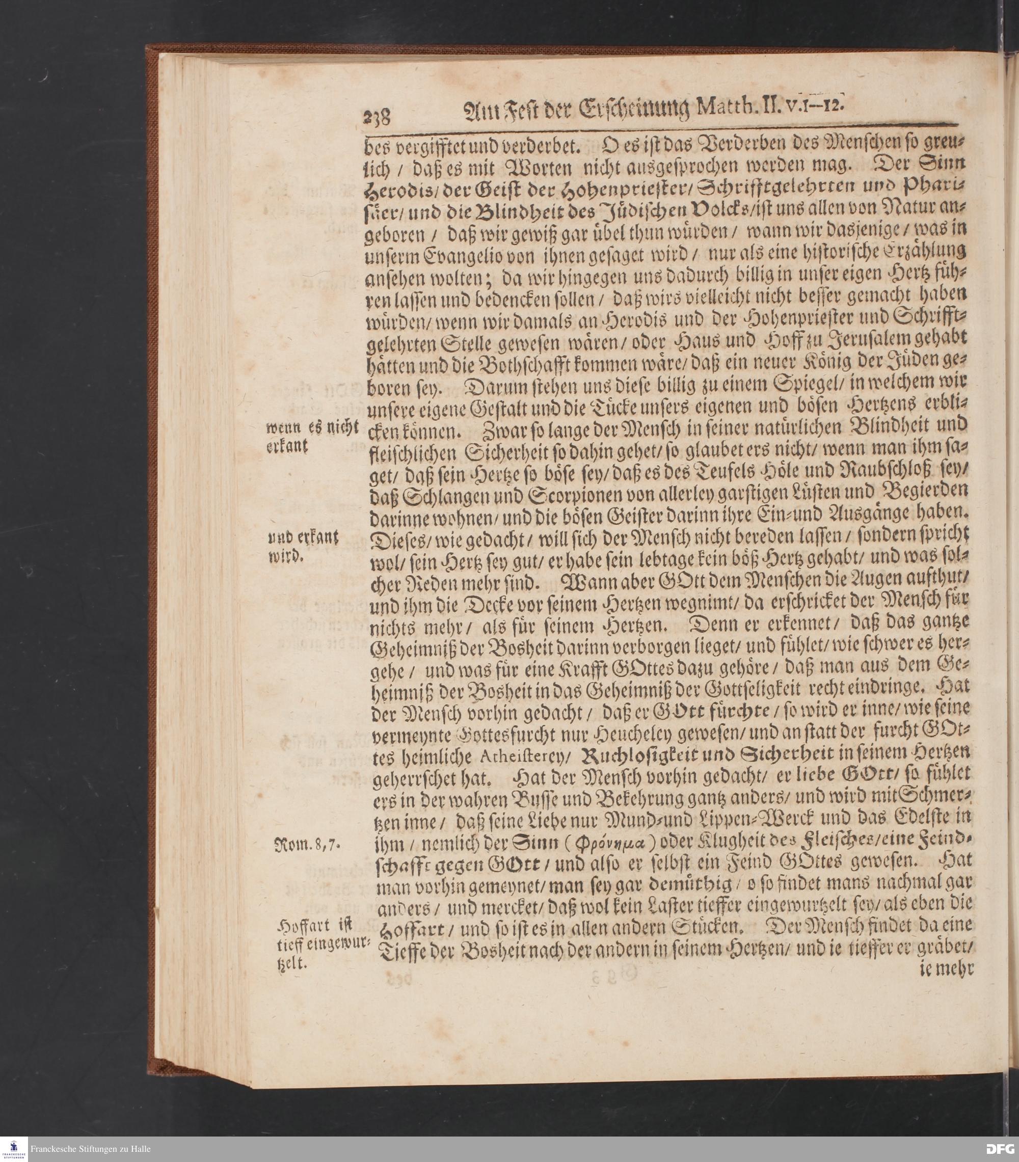 August Hermann Franckens S.Theol.Prof.und Past. Sonn= Fest= und Apostel=Tags=-Predigten / Darinnen Die zum wahren Christenthum gehörige nöthigste und vornehmste Materien abgehandelt sind; Nunmehro von neuen wieder durchgesehen / und mit einigen Predigten vermehret / Nebst den darzu nützlichen Registern. Die vierte EDITION. HALLE / gedruckt und verlegt im Wäysen=Hause / MDCCXV. Mit Königl.Preuß.und Churfl.Brandenb.Privil.