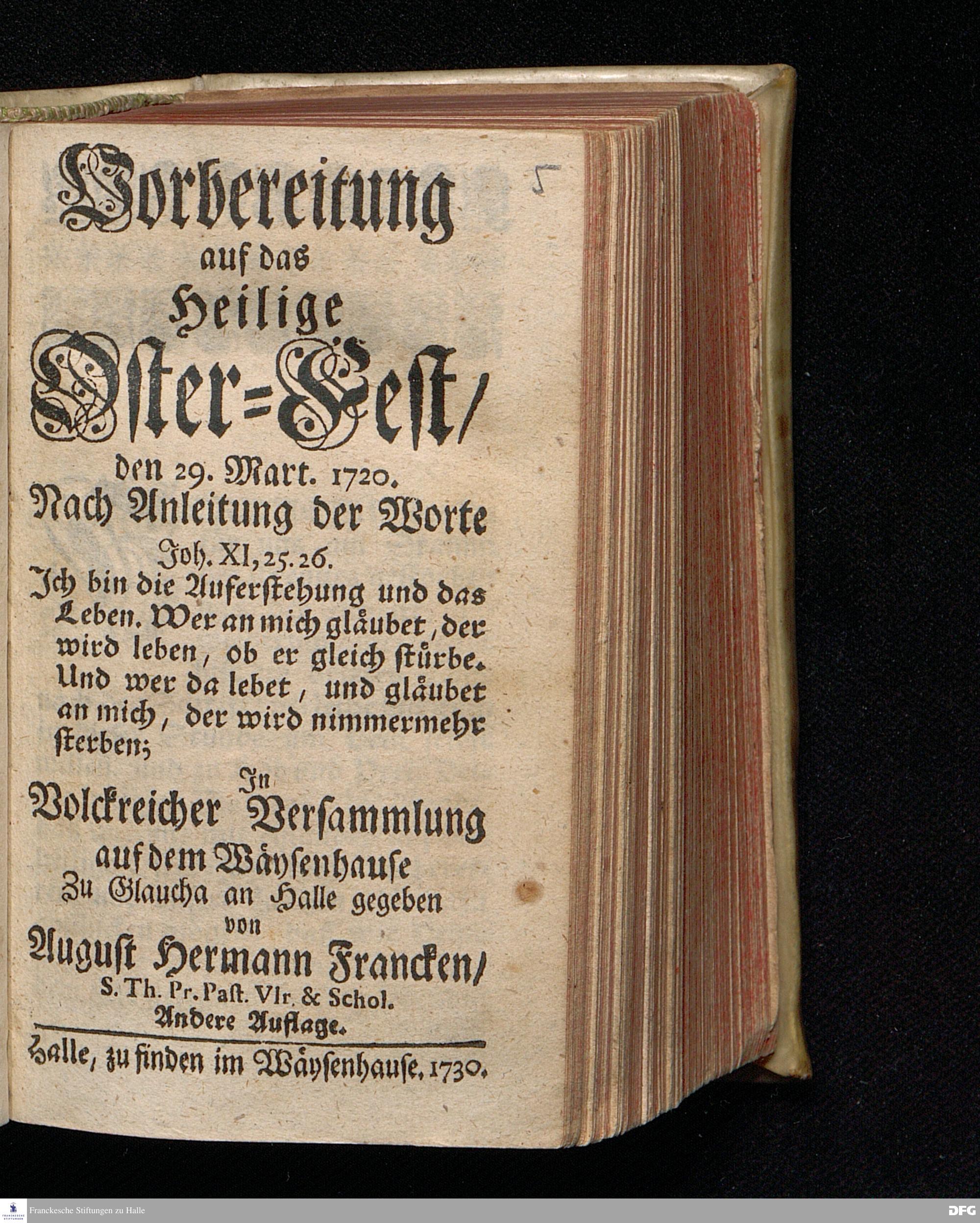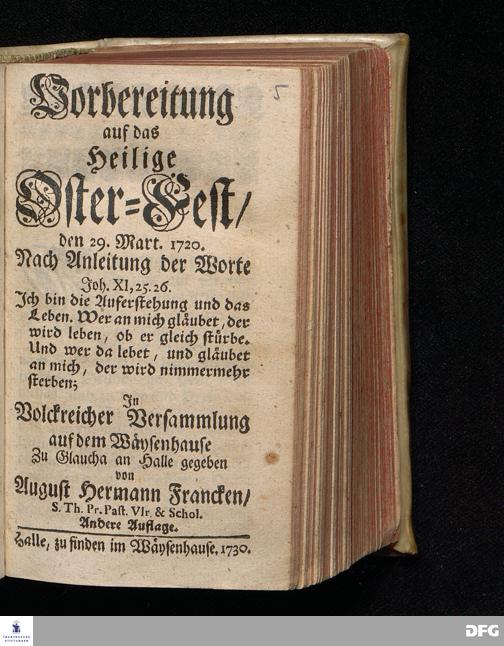 Vorbereitung auf das Heilige Oster=Fest / den 29.Mart. 1720. Nach Anleitung der Worte Joh.XI, 25.26. [Bibelzitat.] In Volckreicher Versammlung auf dem Wäysenhause Zu Glaucha an Halle gegeben von August Hermann Francken / S.Th.Pr.Past.Vlr.& Schol. Andere Auflage. Halle, zu finden im Wäysenhause. 1730.