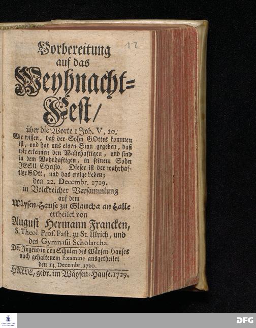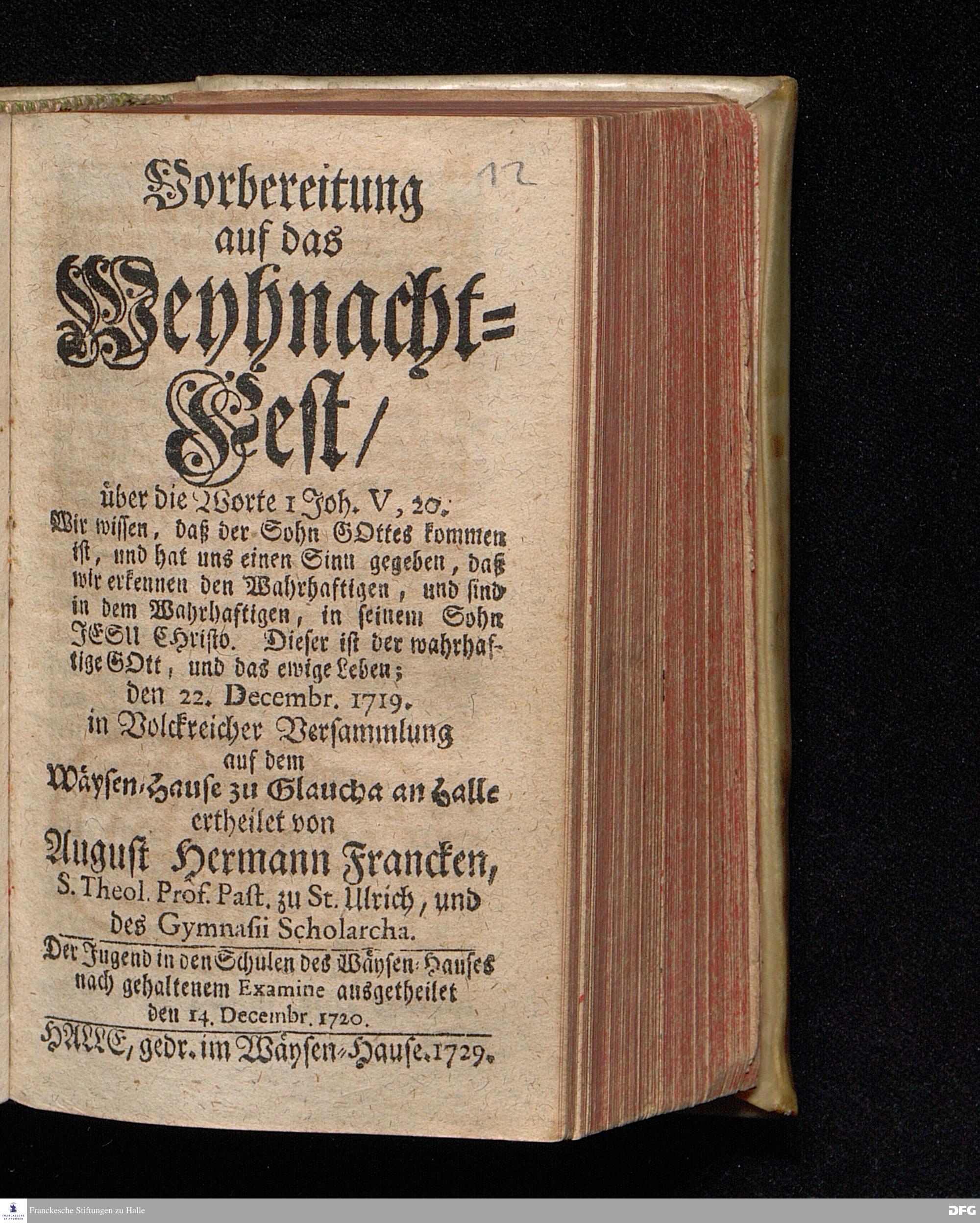 Vorbereitung auf das Weyhnacht=Fest / über die Worte 1 Joh.V, 20. [Bibelzitat;] den 22.Decembr. 1719. in Volckreicher Versammlung auf dem Wäysen=Hause zu Glaucha an Halle ertheilet von August Hermann Francken, S.Theol.Prof.Past. zu St.Ulrich, und des Gymnasii Scholarcha. Der Jugend in den Schulen des Wäysen=Hauses nach gehaltenem Examine ausgetheilet den 14.Decembr.1720. HALLE, gedr.im Wäysen=Hause. 1729.