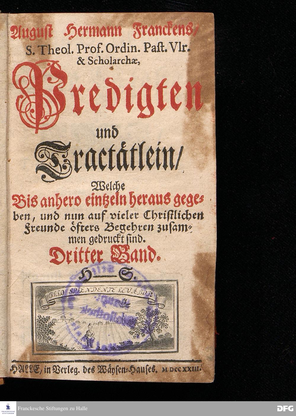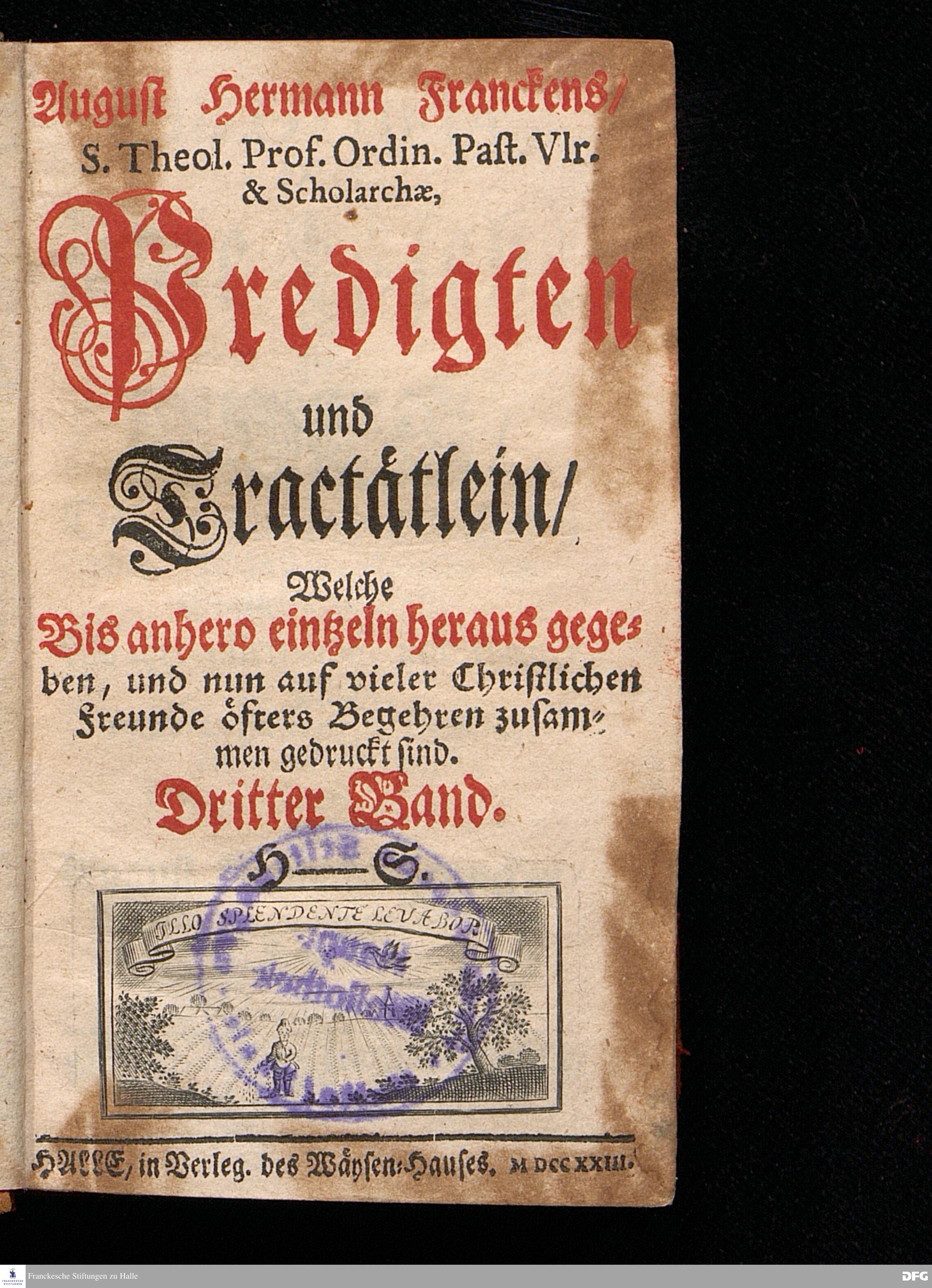 August Hermann Franckens / S.Theol.Prof.Ordin.Past.Vlr.& Scholarchæ, Predigten und Tractätlein / Welche Bis anhero eintzeln heraus gegeben, und nun auf vieler Christlichen Freunde öfters Begehren zusammen gedruckt sind. Dritter Band. H - S. HALLE, in Verleg.des Wäysen=Hauses. MDCCXXIII.