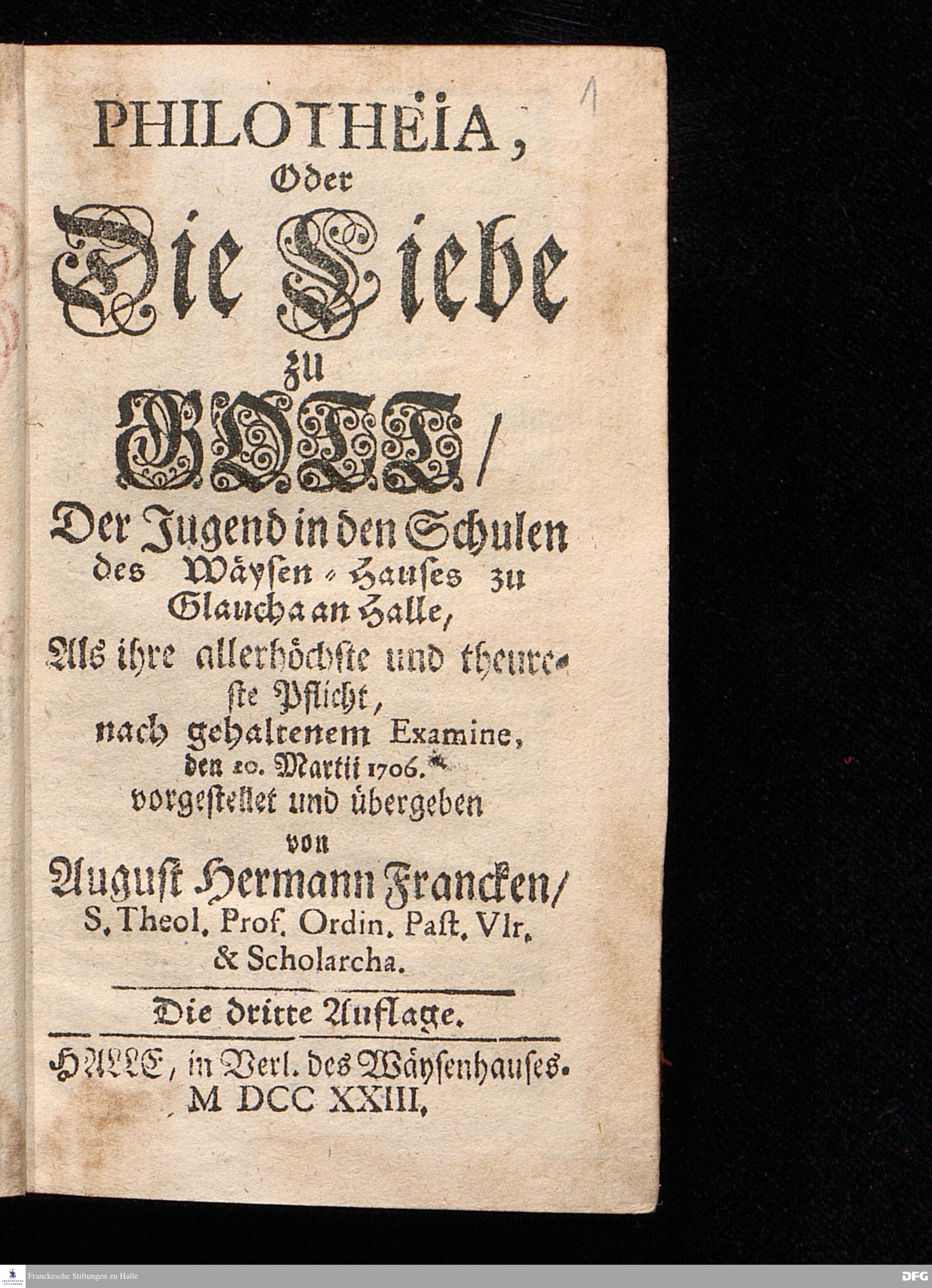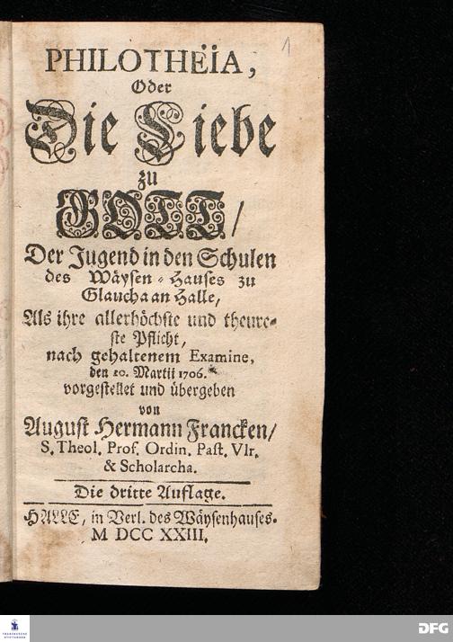 PHILOTHEIA, Oder Die Liebe zu GOTT / Der Jugend in den Schulen des Wäysen=Hauses zu Glaucha an Halle, Als ihre allerhöchste und theureste Pflicht, nach gehaltenem Examine, den 20.Martii 1706. vorgestellet und übergeben von August Hermann Francken / S.Theol.Prof.Ordin.Past.Vlr.& Scholarcha. Die dritte Auflage. HALLE, in Verl.des Wäysenhauses. MDCCXXIII.