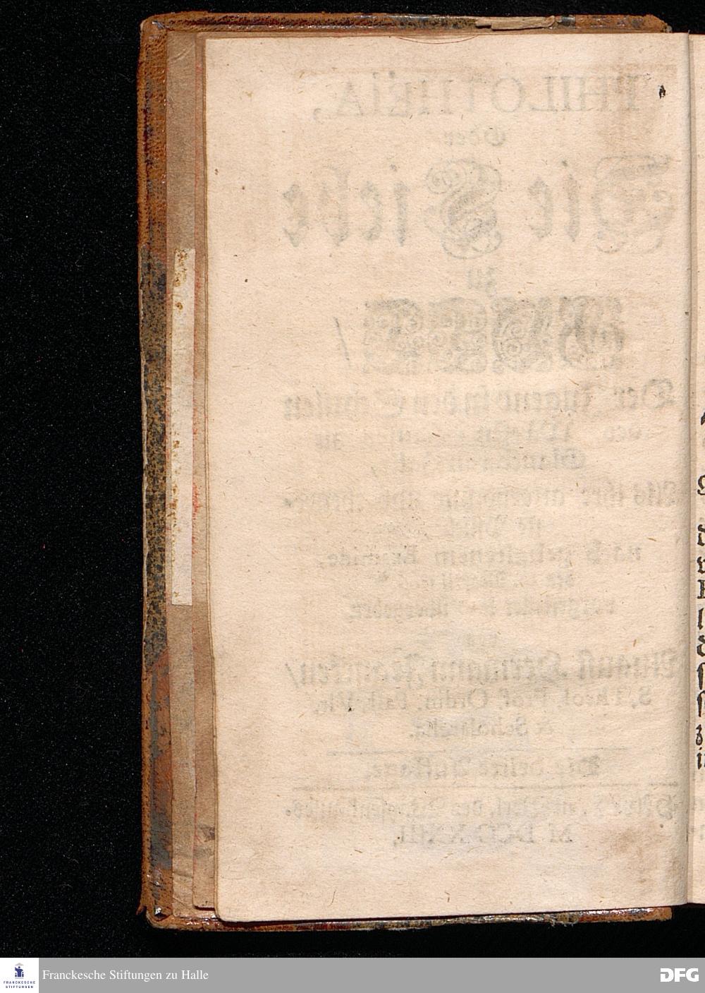 PHILOTHEIA, Oder Die Liebe zu GOTT / Der Jugend in den Schulen des Wäysen=Hauses zu Glaucha an Halle, Als ihre allerhöchste und theureste Pflicht, nach gehaltenem Examine, den 20.Martii 1706. vorgestellet und übergeben von August Hermann Francken / S.Theol.Prof.Ordin.Past.Vlr.& Scholarcha. Die dritte Auflage. HALLE, in Verl.des Wäysenhauses. MDCCXXIII.