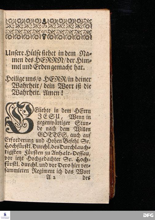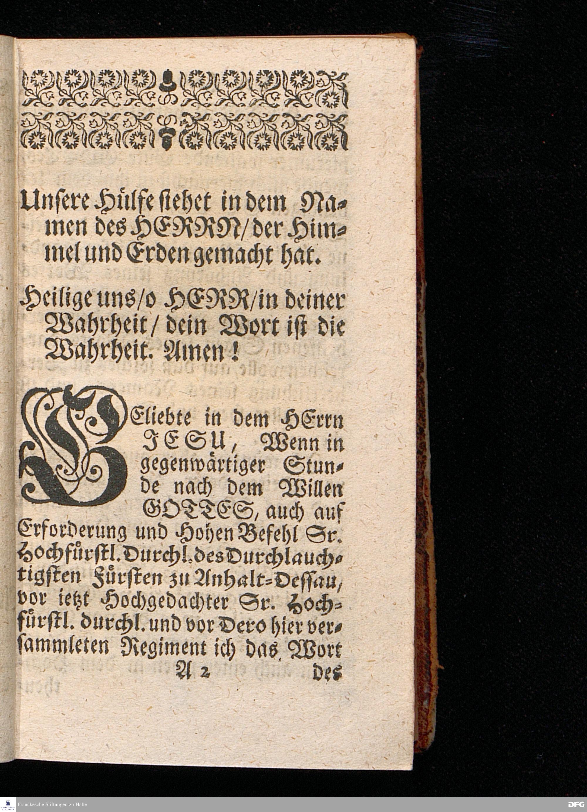 Der Helden=Muth der Gläubigen, In einer vor dem hier versammleten Hochfürstlichen Dessauischen Regiment, am Sonntag Jubilate 1720. gehaltenen Predigt / aus denen dazu vorgeschriebenen Text=Worten, Luc.XII,1--5. in der Schul=Kirche zu Halle vorgestellet von August Hermann Francken / S.Th.Prof.Past.Vlr.& Schol. Andere Auflage. HALLE, gedruckt im Wäysen=Hause. MDCCXXIII.