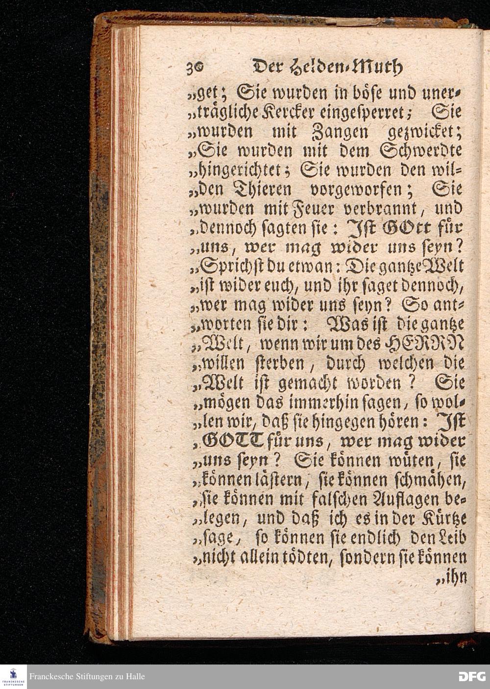 Der Helden=Muth der Gläubigen, In einer vor dem hier versammleten Hochfürstlichen Dessauischen Regiment, am Sonntag Jubilate 1720. gehaltenen Predigt / aus denen dazu vorgeschriebenen Text=Worten, Luc.XII,1--5. in der Schul=Kirche zu Halle vorgestellet von August Hermann Francken / S.Th.Prof.Past.Vlr.& Schol. Andere Auflage. HALLE, gedruckt im Wäysen=Hause. MDCCXXIII.