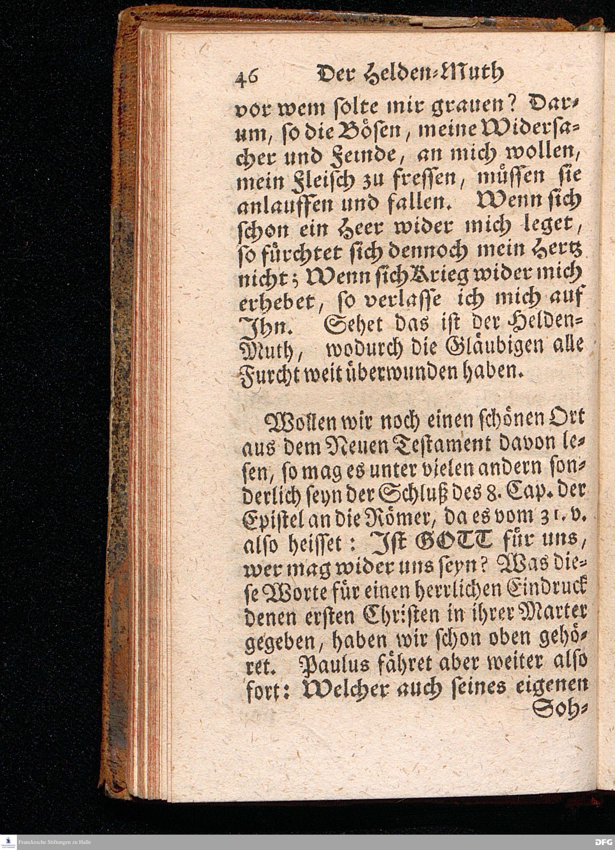 Der Helden=Muth der Gläubigen, In einer vor dem hier versammleten Hochfürstlichen Dessauischen Regiment, am Sonntag Jubilate 1720. gehaltenen Predigt / aus denen dazu vorgeschriebenen Text=Worten, Luc.XII,1--5. in der Schul=Kirche zu Halle vorgestellet von August Hermann Francken / S.Th.Prof.Past.Vlr.& Schol. Andere Auflage. HALLE, gedruckt im Wäysen=Hause. MDCCXXIII.