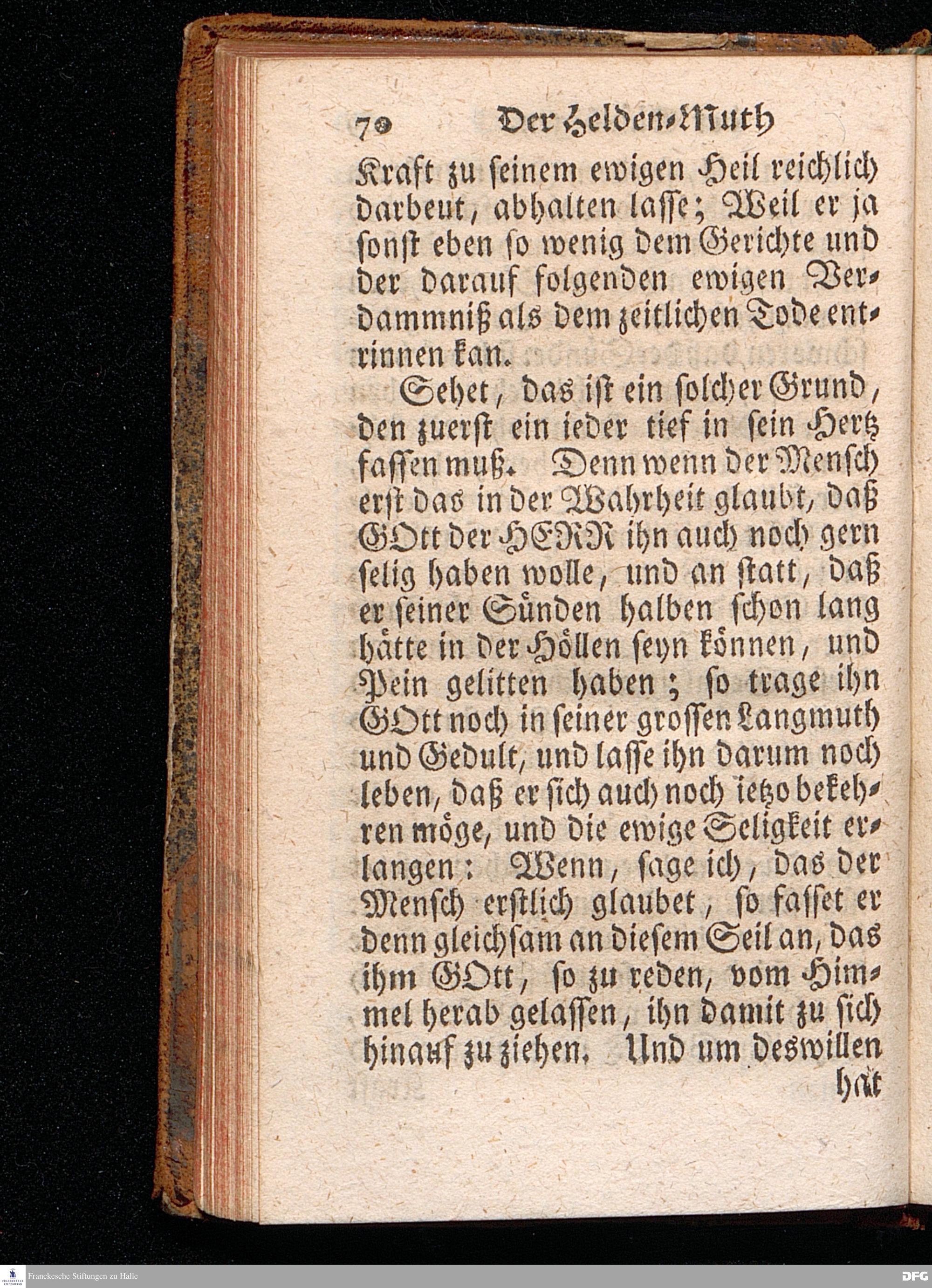 Der Helden=Muth der Gläubigen, In einer vor dem hier versammleten Hochfürstlichen Dessauischen Regiment, am Sonntag Jubilate 1720. gehaltenen Predigt / aus denen dazu vorgeschriebenen Text=Worten, Luc.XII,1--5. in der Schul=Kirche zu Halle vorgestellet von August Hermann Francken / S.Th.Prof.Past.Vlr.& Schol. Andere Auflage. HALLE, gedruckt im Wäysen=Hause. MDCCXXIII.