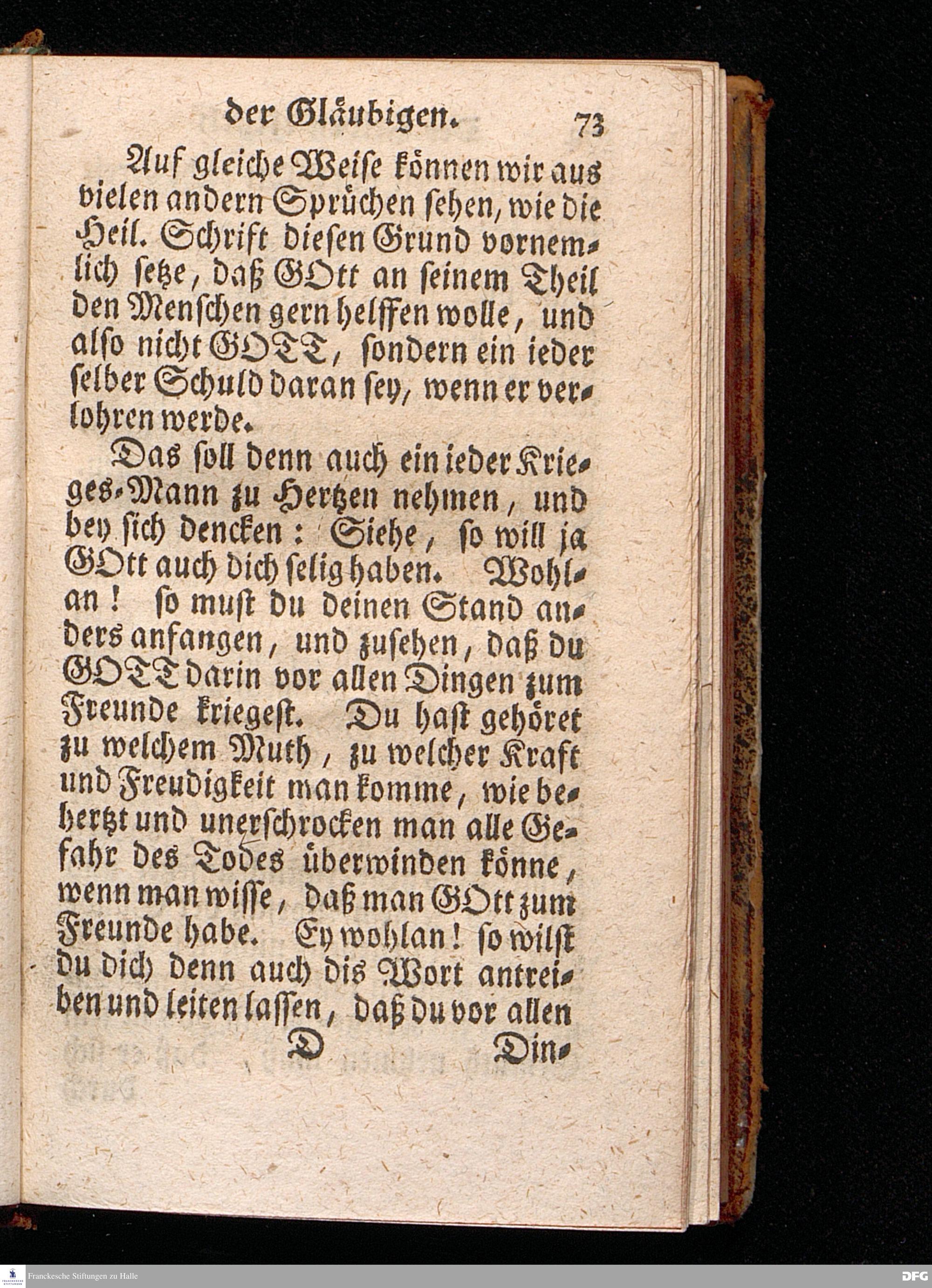 Der Helden=Muth der Gläubigen, In einer vor dem hier versammleten Hochfürstlichen Dessauischen Regiment, am Sonntag Jubilate 1720. gehaltenen Predigt / aus denen dazu vorgeschriebenen Text=Worten, Luc.XII,1--5. in der Schul=Kirche zu Halle vorgestellet von August Hermann Francken / S.Th.Prof.Past.Vlr.& Schol. Andere Auflage. HALLE, gedruckt im Wäysen=Hause. MDCCXXIII.