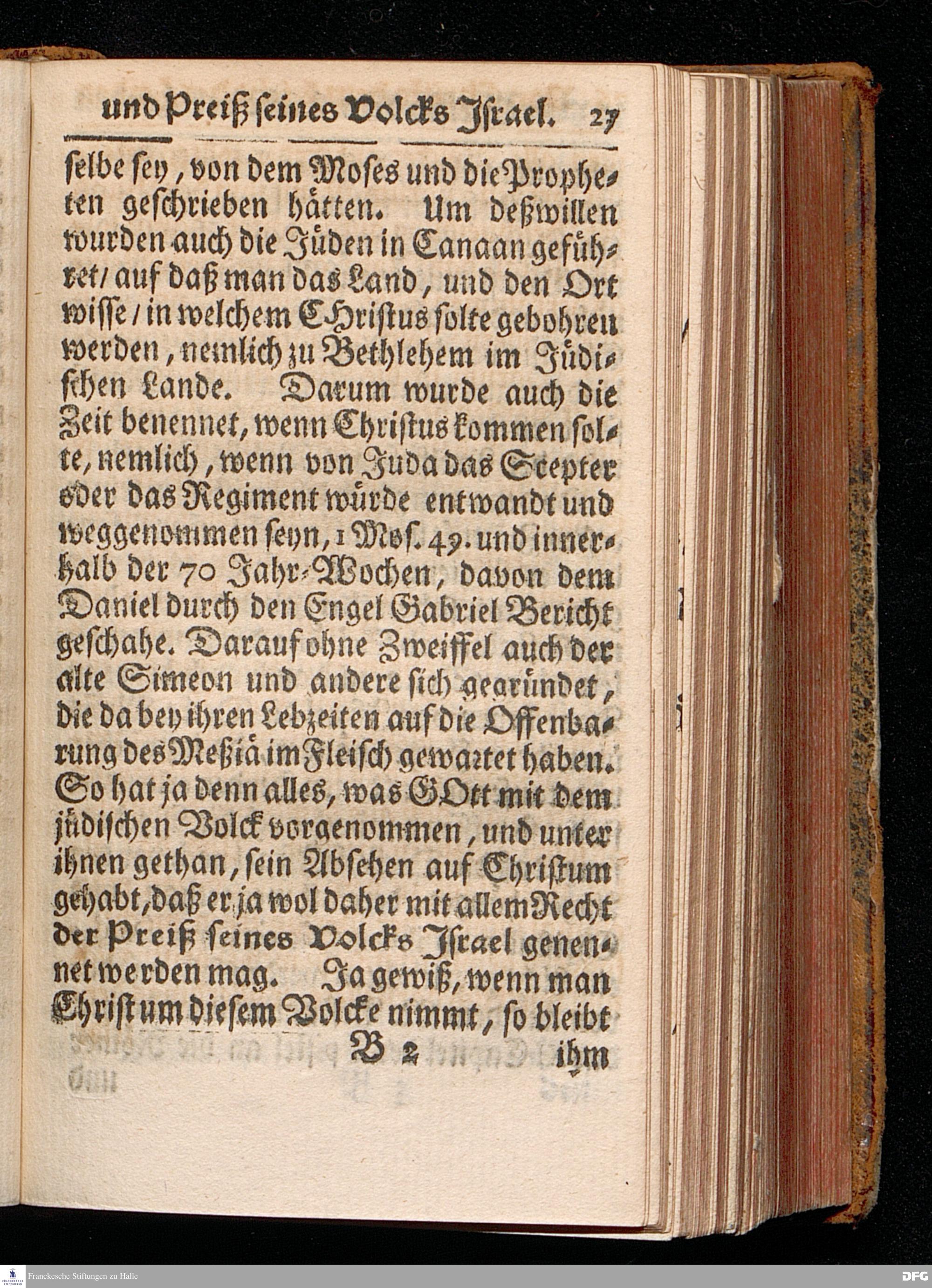 JEsus CHristus als das Licht der Heyden / und der Preiß Israels / Nach Anleitung des Evangel. Textes Luc.II, 22--32. Am Tage der Reinigung Mariä Anno 1714. auf Veranlassung einer damals angestelleten Jüden=Tauffe / In der St.Georgen=Kirche zu Glaucha an Halle vorgestellet / Von August Hermann Francken / S.Theol.Prof.und Past.Vlric. Andere Auflage. Der bey obgedachter Tauffe gehaltene Sermon und das Examen mit dem Täufling ist zugleich mit hieran gedrucket. HALLE, In Verlegung des Wäysen=Hauses. 1723