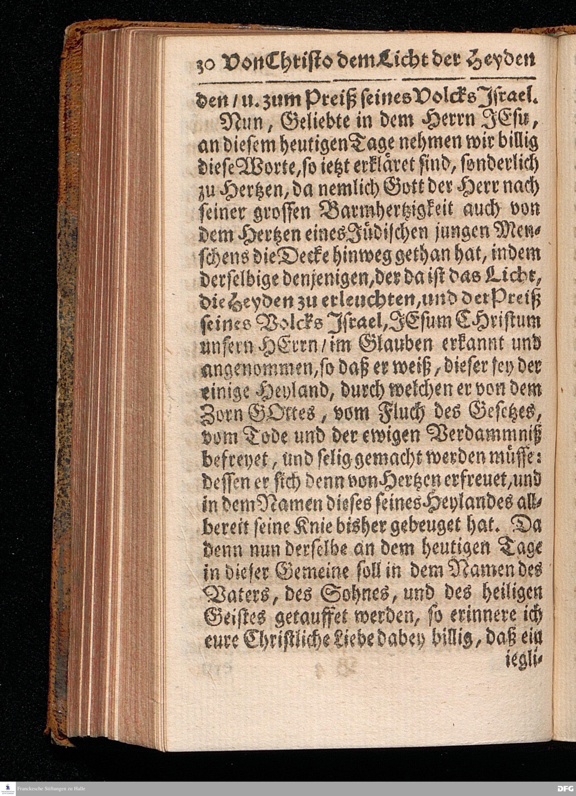 JEsus CHristus als das Licht der Heyden / und der Preiß Israels / Nach Anleitung des Evangel. Textes Luc.II, 22--32. Am Tage der Reinigung Mariä Anno 1714. auf Veranlassung einer damals angestelleten Jüden=Tauffe / In der St.Georgen=Kirche zu Glaucha an Halle vorgestellet / Von August Hermann Francken / S.Theol.Prof.und Past.Vlric. Andere Auflage. Der bey obgedachter Tauffe gehaltene Sermon und das Examen mit dem Täufling ist zugleich mit hieran gedrucket. HALLE, In Verlegung des Wäysen=Hauses. 1723