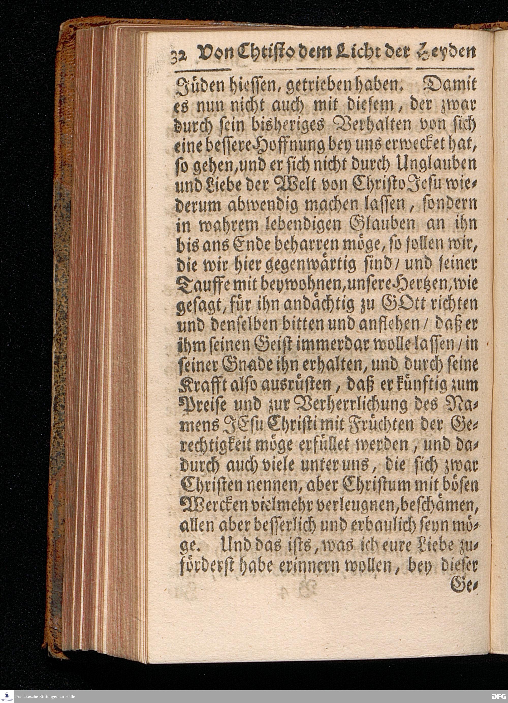 JEsus CHristus als das Licht der Heyden / und der Preiß Israels / Nach Anleitung des Evangel. Textes Luc.II, 22--32. Am Tage der Reinigung Mariä Anno 1714. auf Veranlassung einer damals angestelleten Jüden=Tauffe / In der St.Georgen=Kirche zu Glaucha an Halle vorgestellet / Von August Hermann Francken / S.Theol.Prof.und Past.Vlric. Andere Auflage. Der bey obgedachter Tauffe gehaltene Sermon und das Examen mit dem Täufling ist zugleich mit hieran gedrucket. HALLE, In Verlegung des Wäysen=Hauses. 1723