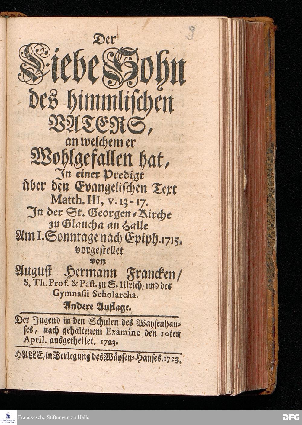 Der Liebe Sohn des himmlischen VATERS, an welchem er Wohlgefallen hat, In einer Predigt über den Evangelischen Text Matth.III, v.13-17. In der St.Georgen=Kirche zu Glaucha an Halle Am I.Sonntage nach Epiph. 1715. vorgestellet von August Hermann Francken / S.Th.Prof.& Past.zu S.Ulrich, und des Gymnasii Scholarcha. Andere Auflage. Der Jugend in den Schulen des Waysenhauses, nach gehaltenem Examine den 10ten April.ausgetheilet.1723. HALLE, In Verlegung des Wäysen=Hauses. 1723.