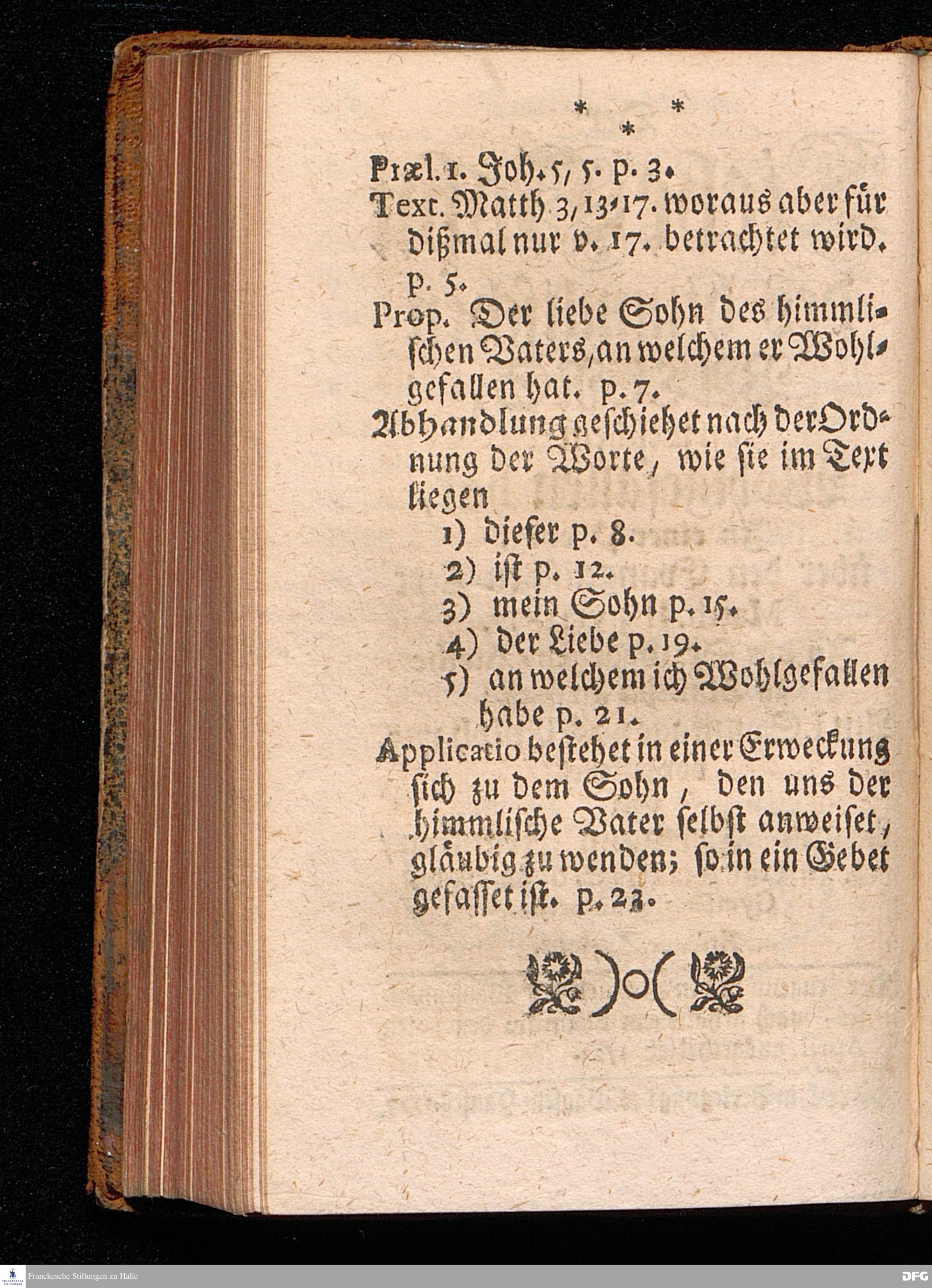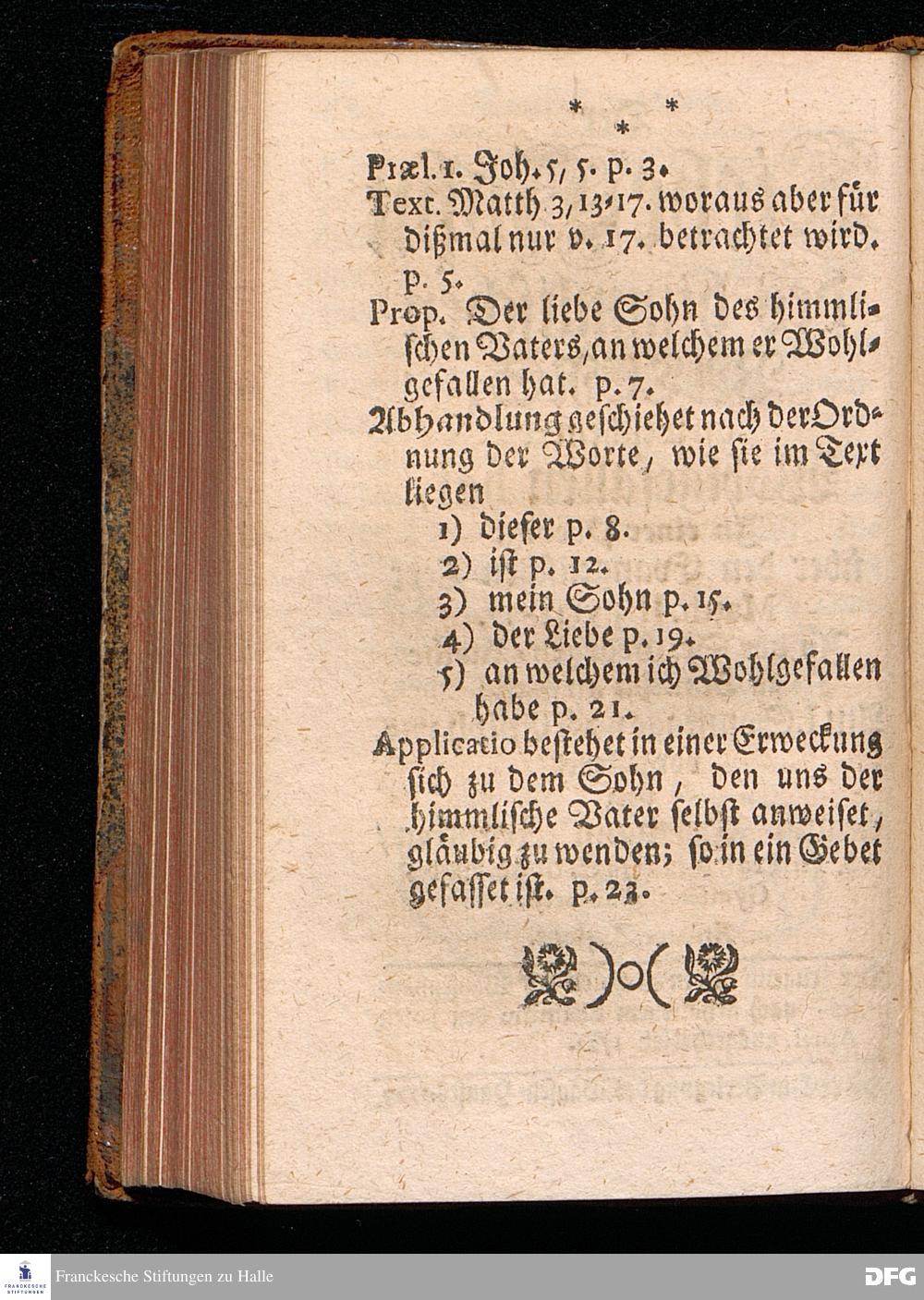 Der Liebe Sohn des himmlischen VATERS, an welchem er Wohlgefallen hat, In einer Predigt über den Evangelischen Text Matth.III, v.13-17. In der St.Georgen=Kirche zu Glaucha an Halle Am I.Sonntage nach Epiph. 1715. vorgestellet von August Hermann Francken / S.Th.Prof.& Past.zu S.Ulrich, und des Gymnasii Scholarcha. Andere Auflage. Der Jugend in den Schulen des Waysenhauses, nach gehaltenem Examine den 10ten April.ausgetheilet.1723. HALLE, In Verlegung des Wäysen=Hauses. 1723.