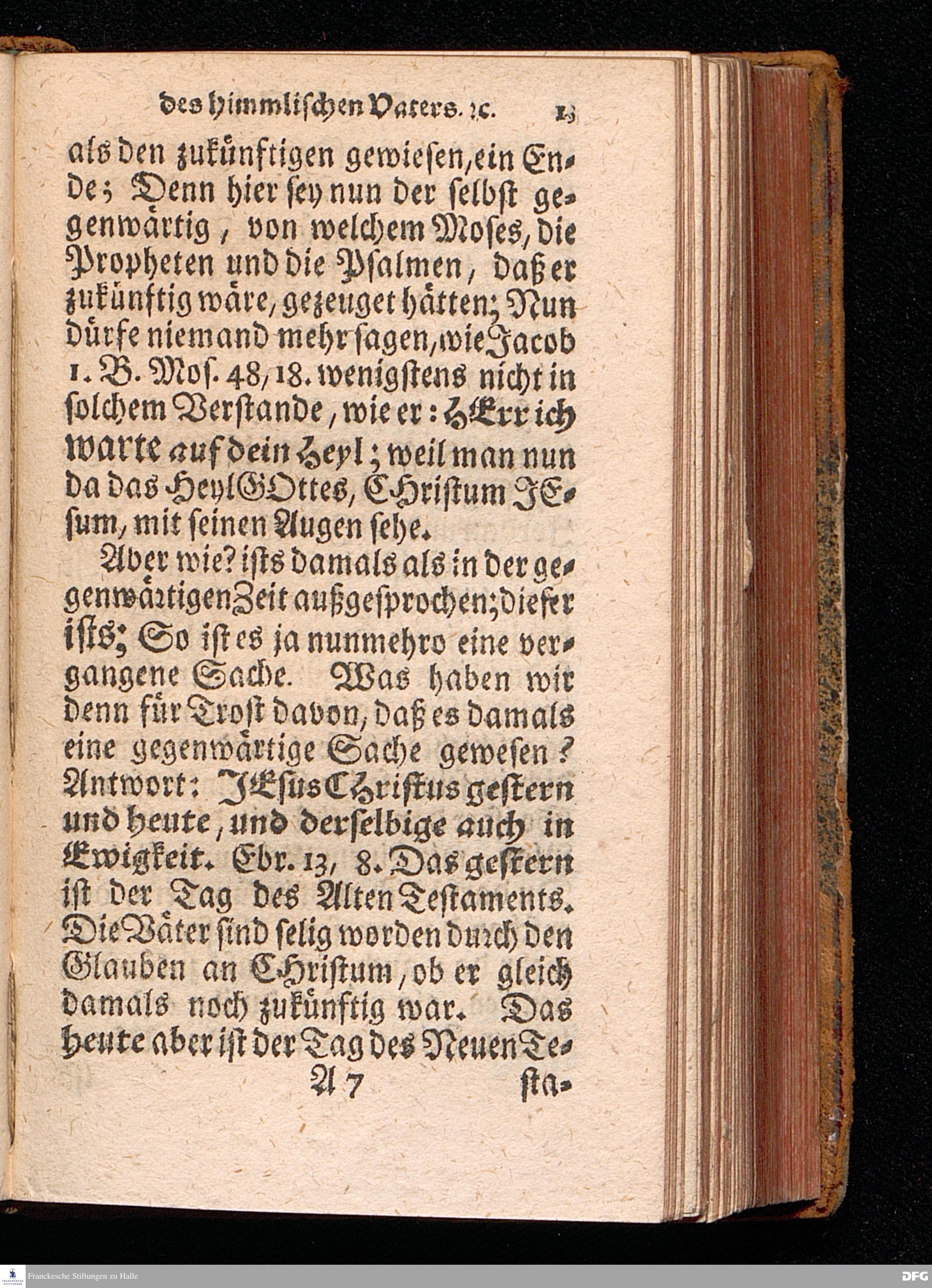 Der Liebe Sohn des himmlischen VATERS, an welchem er Wohlgefallen hat, In einer Predigt über den Evangelischen Text Matth.III, v.13-17. In der St.Georgen=Kirche zu Glaucha an Halle Am I.Sonntage nach Epiph. 1715. vorgestellet von August Hermann Francken / S.Th.Prof.& Past.zu S.Ulrich, und des Gymnasii Scholarcha. Andere Auflage. Der Jugend in den Schulen des Waysenhauses, nach gehaltenem Examine den 10ten April.ausgetheilet.1723. HALLE, In Verlegung des Wäysen=Hauses. 1723.