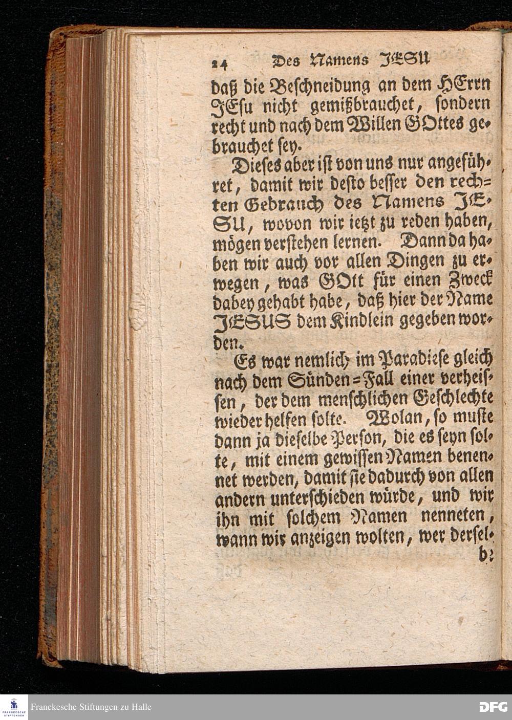 Des Namens JESU Herrliche Bedeutung, rechter Gebrauch, wie auch Segens= und Lebens=volle Kraft, In einer Predigt über den Evangelischen Text Luc.II. v.21. In der St.Georgen=Kirche zu Glaucha an Halle Am neuen Jahrs=Tage 1715. vorgestellet Von August Hermann Francken, S.Theol.Prof.Ord.& Past.Ulric. Andere Auflage. HALLE, In Verlegung des Wäysenhauses, 1742.