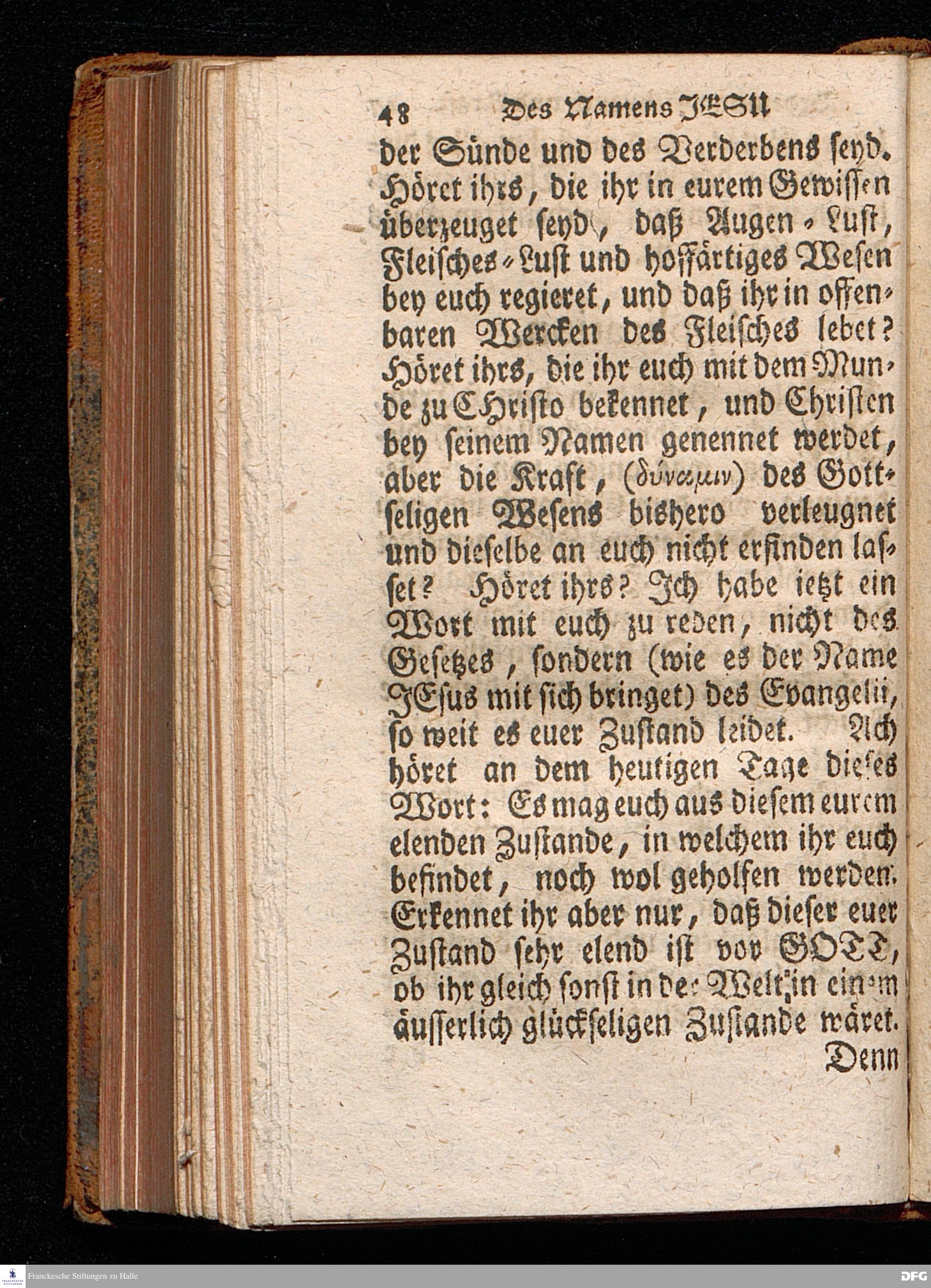 Des Namens JESU Herrliche Bedeutung, rechter Gebrauch, wie auch Segens= und Lebens=volle Kraft, In einer Predigt über den Evangelischen Text Luc.II. v.21. In der St.Georgen=Kirche zu Glaucha an Halle Am neuen Jahrs=Tage 1715. vorgestellet Von August Hermann Francken, S.Theol.Prof.Ord.& Past.Ulric. Andere Auflage. HALLE, In Verlegung des Wäysenhauses, 1742.