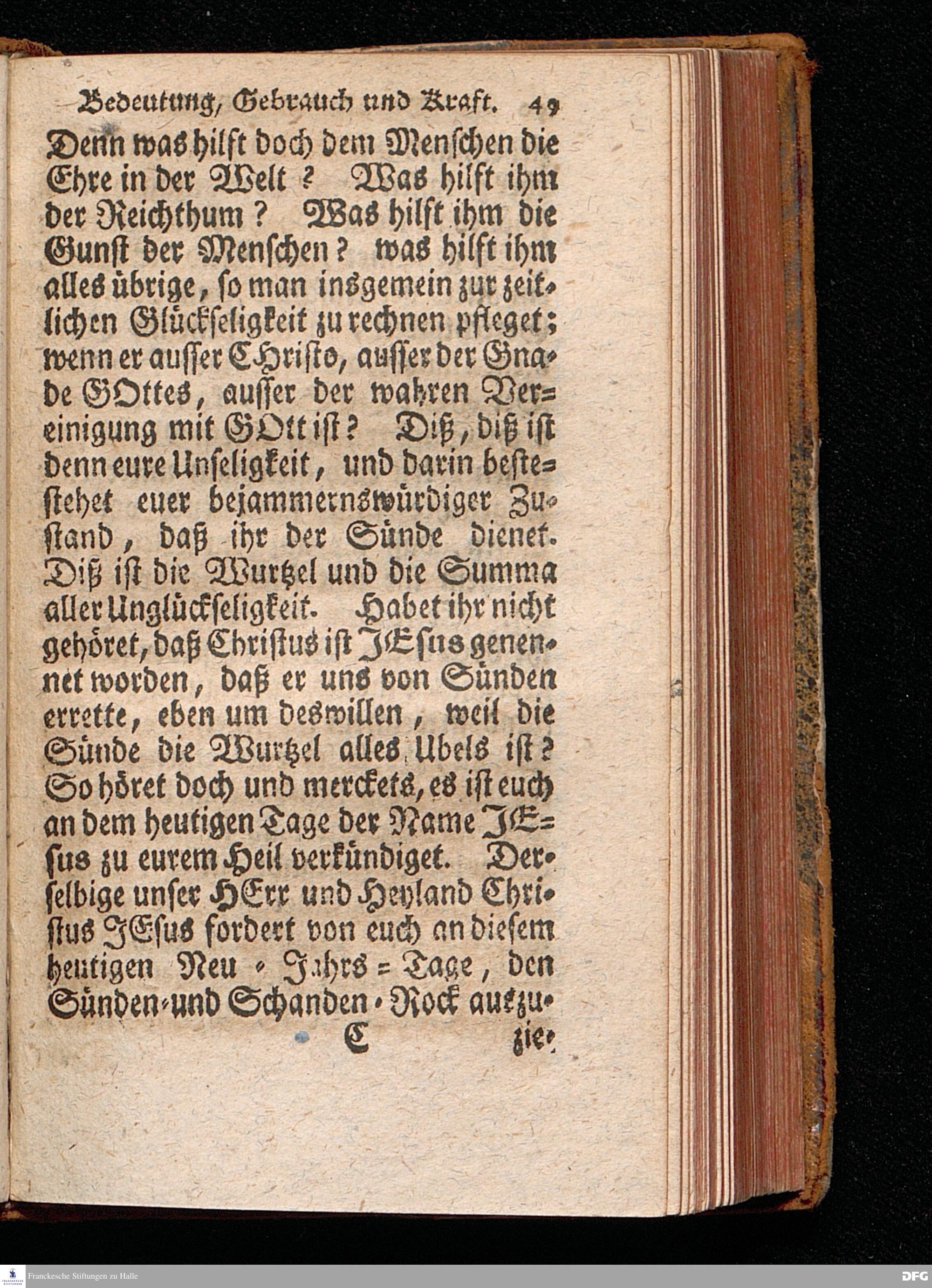 Des Namens JESU Herrliche Bedeutung, rechter Gebrauch, wie auch Segens= und Lebens=volle Kraft, In einer Predigt über den Evangelischen Text Luc.II. v.21. In der St.Georgen=Kirche zu Glaucha an Halle Am neuen Jahrs=Tage 1715. vorgestellet Von August Hermann Francken, S.Theol.Prof.Ord.& Past.Ulric. Andere Auflage. HALLE, In Verlegung des Wäysenhauses, 1742.