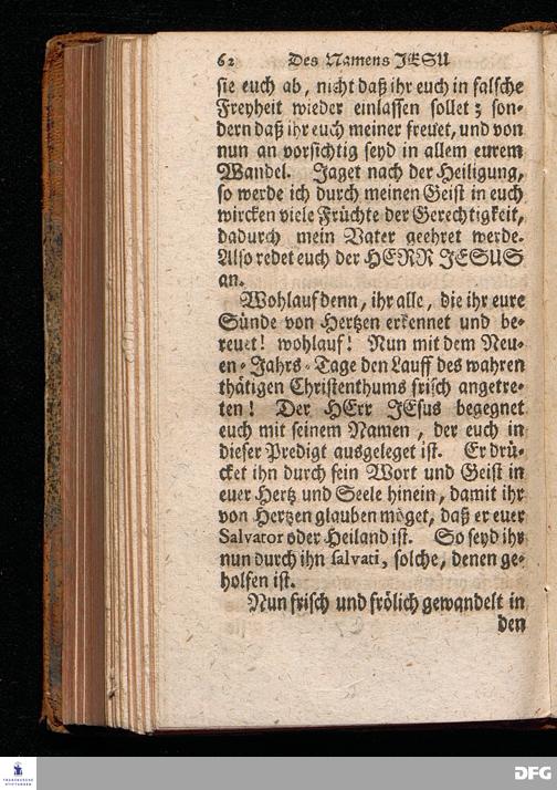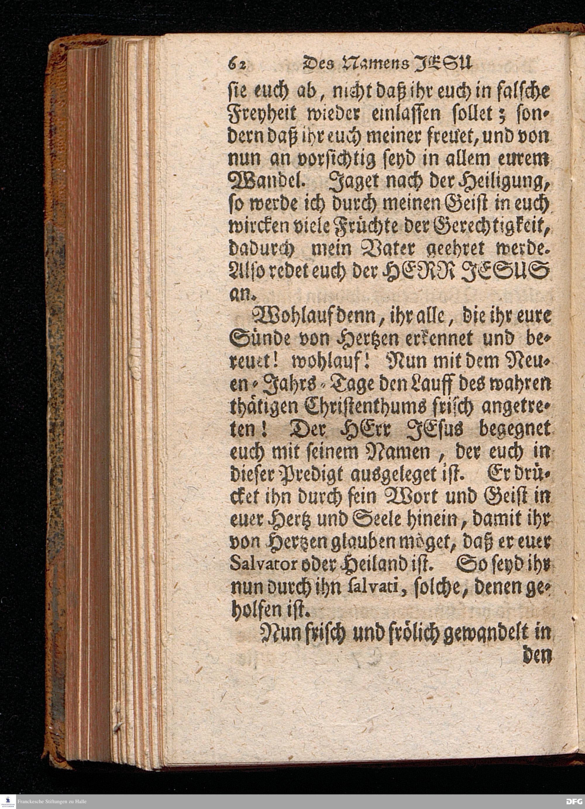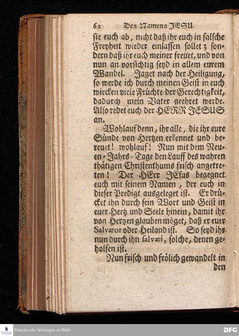 Des Namens JESU Herrliche Bedeutung, rechter Gebrauch, wie auch Segens= und Lebens=volle Kraft, In einer Predigt über den Evangelischen Text Luc.II. v.21. In der St.Georgen=Kirche zu Glaucha an Halle Am neuen Jahrs=Tage 1715. vorgestellet Von August Hermann Francken, S.Theol.Prof.Ord.& Past.Ulric. Andere Auflage. HALLE, In Verlegung des Wäysenhauses, 1742.
