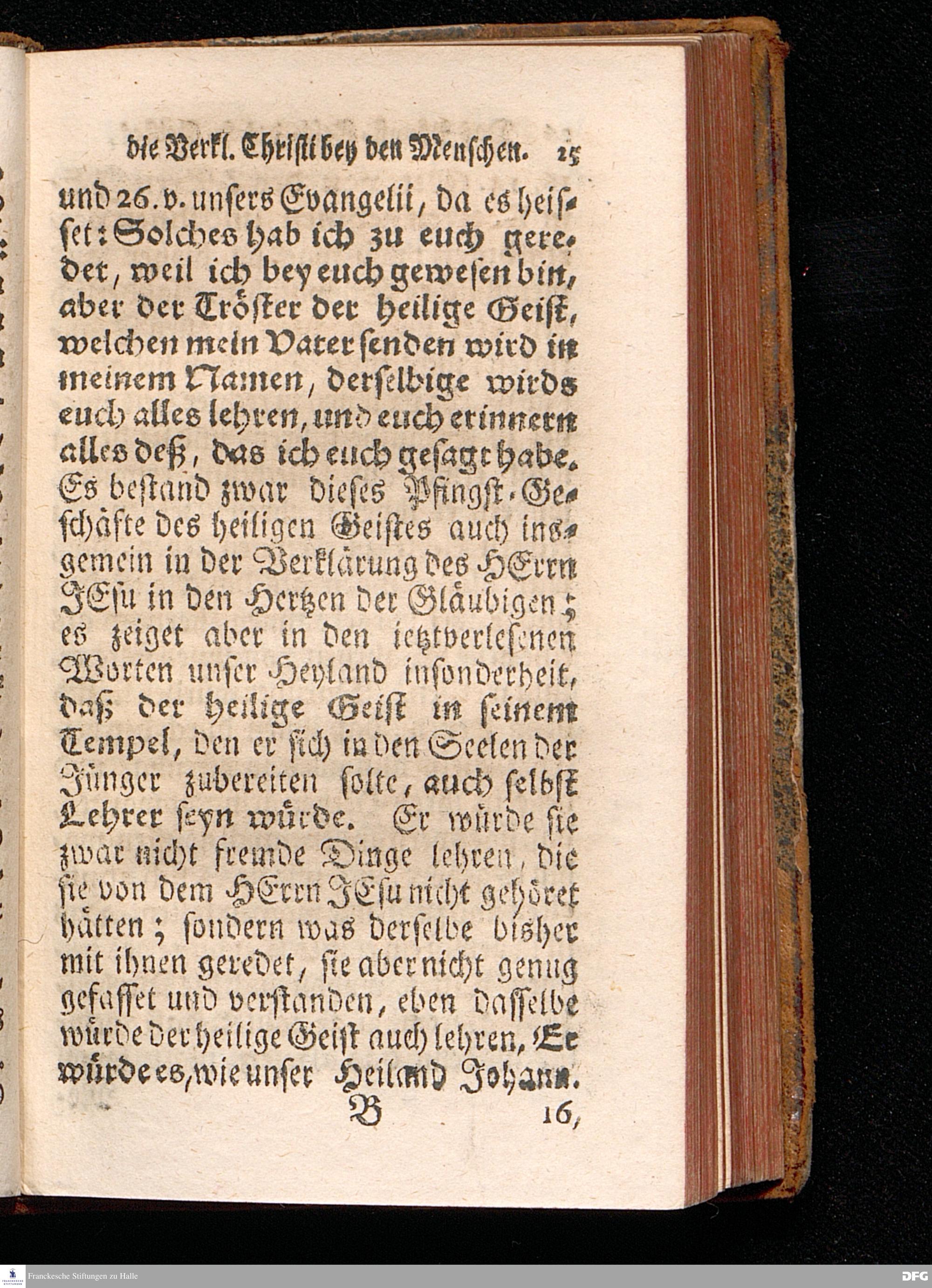 Das Eigentliche Pfingst=Geschäfte Des Heiligen Geistes, Welches ist JESUM CHristum bey denen Menschen zu verklären, Aus dem Evangelischen Text Joh.XIV, 23-31. Am I.Pfingst=Tage MDCCXIV. In der S.Georgen=Kirche zu Glaucha an Halle vorgestellet von August Hermann Francken, S.Theol.Pr.Ord.Past.Vlr.& Sch. Andere Auflage. HALLE, in Verlegung des Wäysenhauses. 1724.