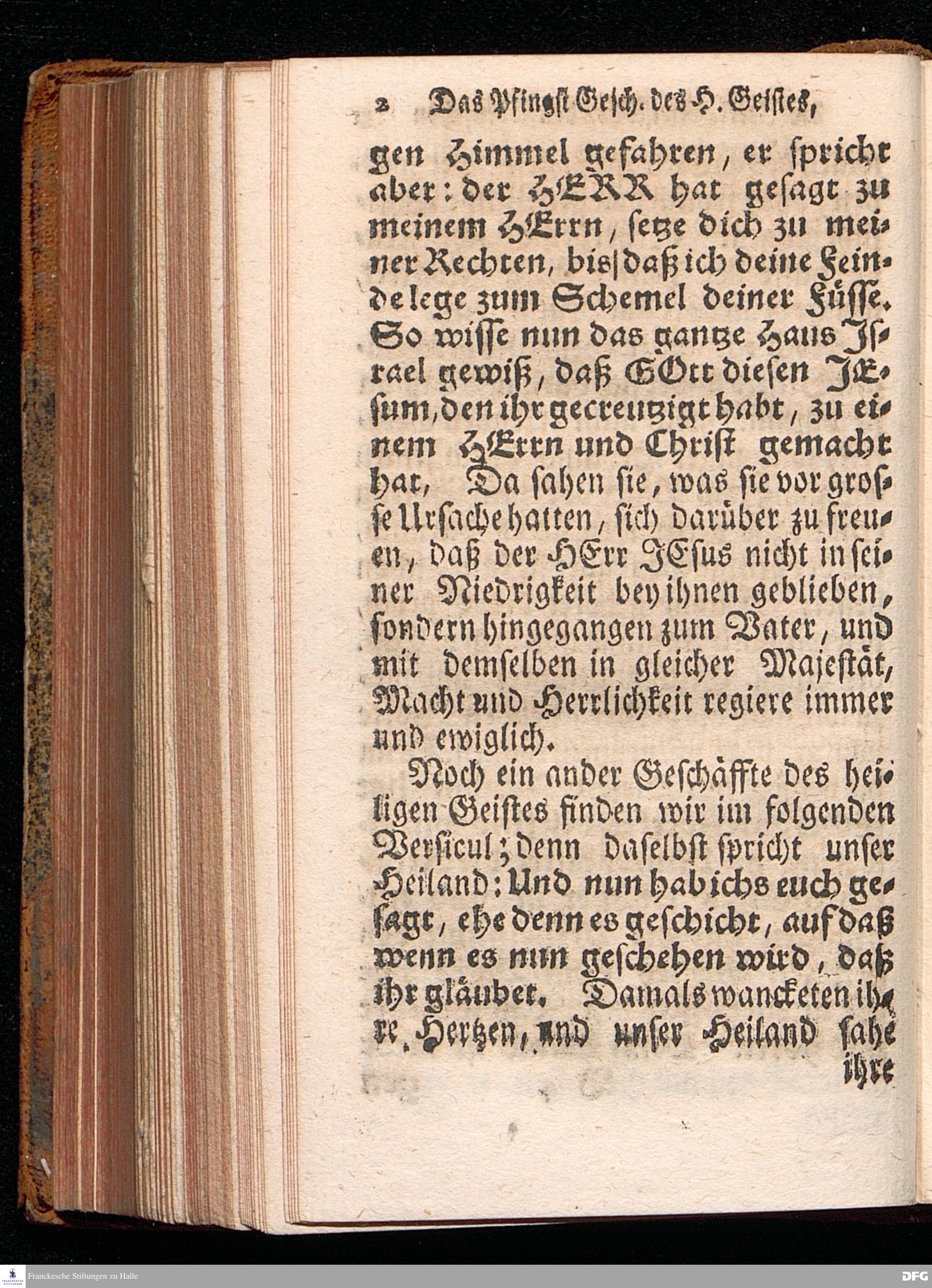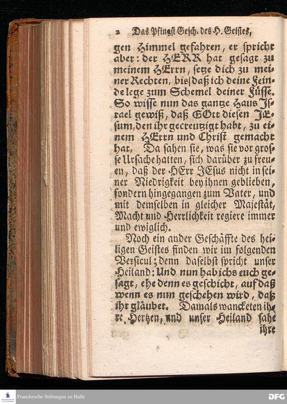Das Eigentliche Pfingst=Geschäfte Des Heiligen Geistes, Welches ist JESUM CHristum bey denen Menschen zu verklären, Aus dem Evangelischen Text Joh.XIV, 23-31. Am I.Pfingst=Tage MDCCXIV. In der S.Georgen=Kirche zu Glaucha an Halle vorgestellet von August Hermann Francken, S.Theol.Pr.Ord.Past.Vlr.& Sch. Andere Auflage. HALLE, in Verlegung des Wäysenhauses. 1724.