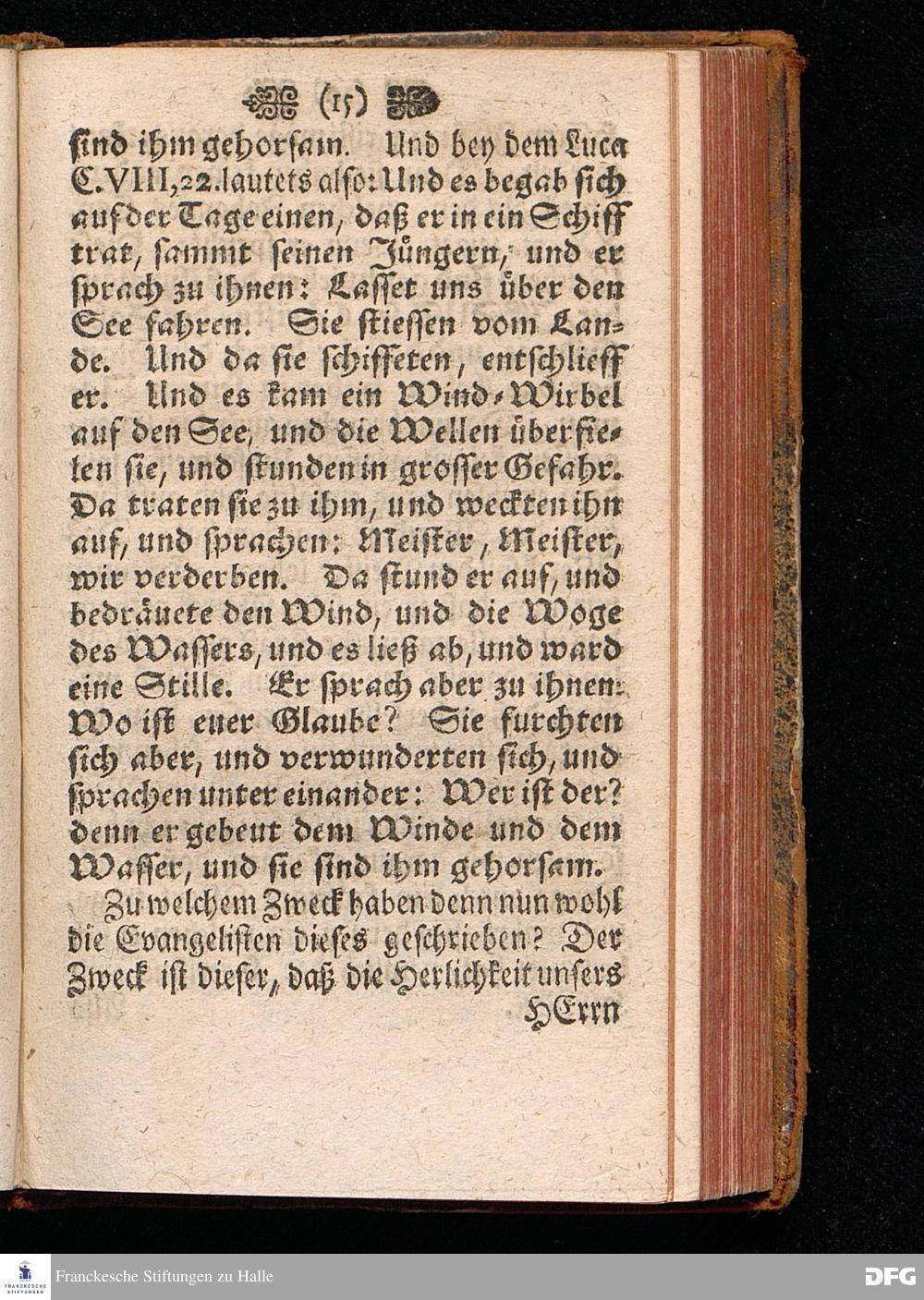 Reitzung zum Völligen Glauben Durch Vorstellung der Herrlichkeit JESU CHRISTI / Aus Der Historie von der Schiffarth CHristi / Matth.VIII, 23---27. In einem öffentlichen Vortrage Im Waysen=Hause zu Glaucha an Halle ertheilet / Und darauf zum Druck gegeben von August Hermann Francken / S.Theol.Prof.Ord.und Past.zu St.Ulrich und des Gymnasii Scholarcha. HALLE, in Verlegung des Wäysen=Hauses, 1715.
