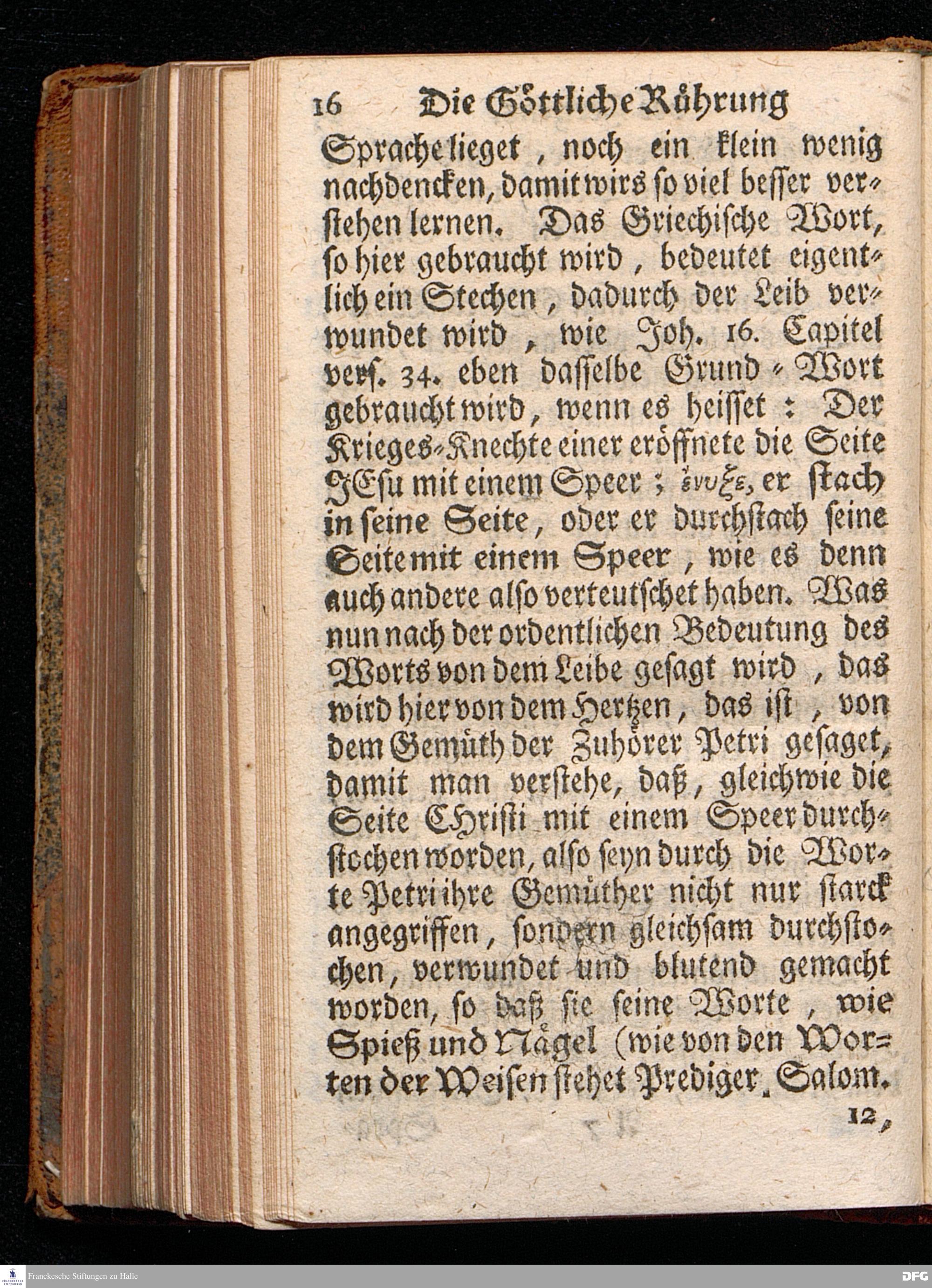 Die Göttliche Rührung des Hertzens, Aus der Apostel=Geschicht[!] II, 37. Da Sie das höreten, gings ihnen durchs Hertz, und sprachen zu Petro und zu den andern Aposteln: Ihr Männer, lieben Brüder, was sollen wir thun? Am Buß=Tage den 10.Jun. 1716. In der St.Ulrichs=Kirche in Halle, vorgestellet von August Hermann Francken, S.Th.P.Ord.& Past. Vlr.und des Gymnasii Schol. Der Jugend in den Schulen des Wäysenhauses nach gehaltenem Examine den 15.Augusti 1716 ausgetheilet. Dritte Auflage. HALLE, In Verlegung des Wäysenhauses. 1732.