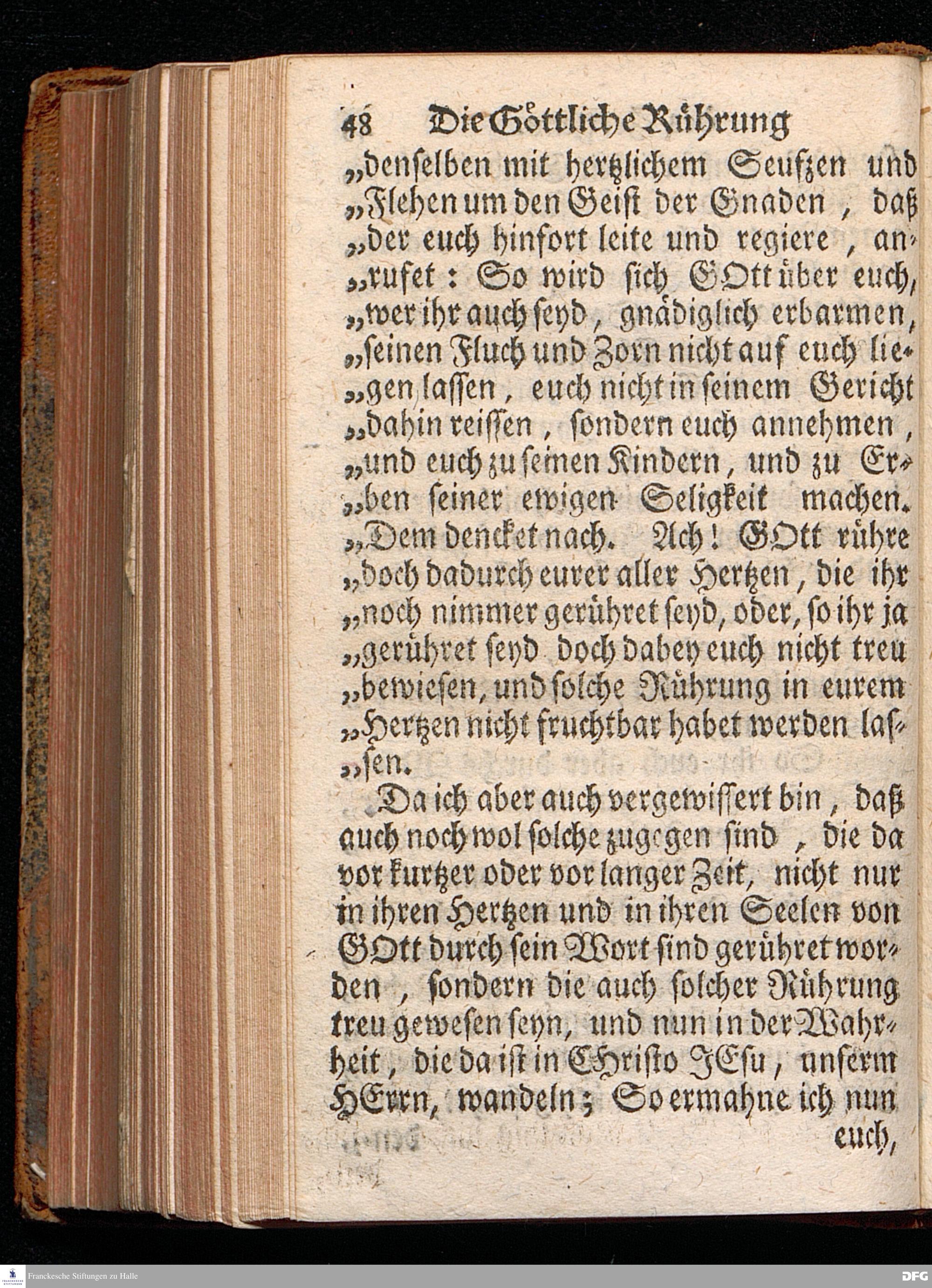 Die Göttliche Rührung des Hertzens, Aus der Apostel=Geschicht[!] II, 37. Da Sie das höreten, gings ihnen durchs Hertz, und sprachen zu Petro und zu den andern Aposteln: Ihr Männer, lieben Brüder, was sollen wir thun? Am Buß=Tage den 10.Jun. 1716. In der St.Ulrichs=Kirche in Halle, vorgestellet von August Hermann Francken, S.Th.P.Ord.& Past. Vlr.und des Gymnasii Schol. Der Jugend in den Schulen des Wäysenhauses nach gehaltenem Examine den 15.Augusti 1716 ausgetheilet. Dritte Auflage. HALLE, In Verlegung des Wäysenhauses. 1732.