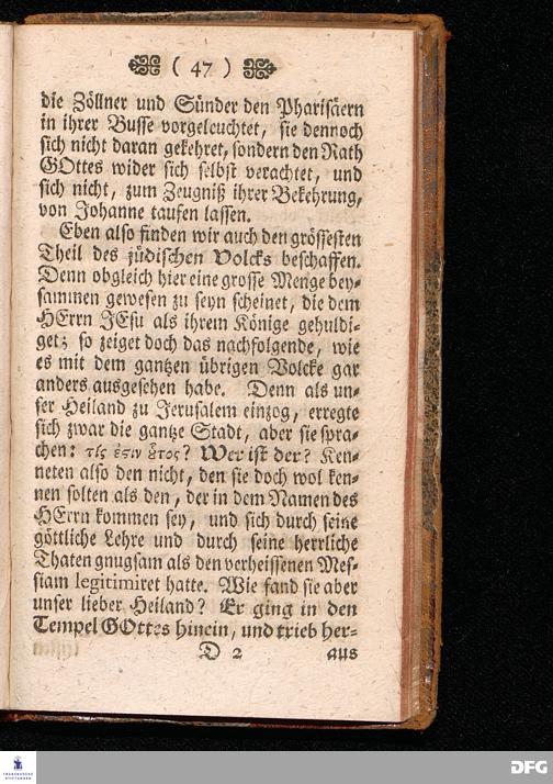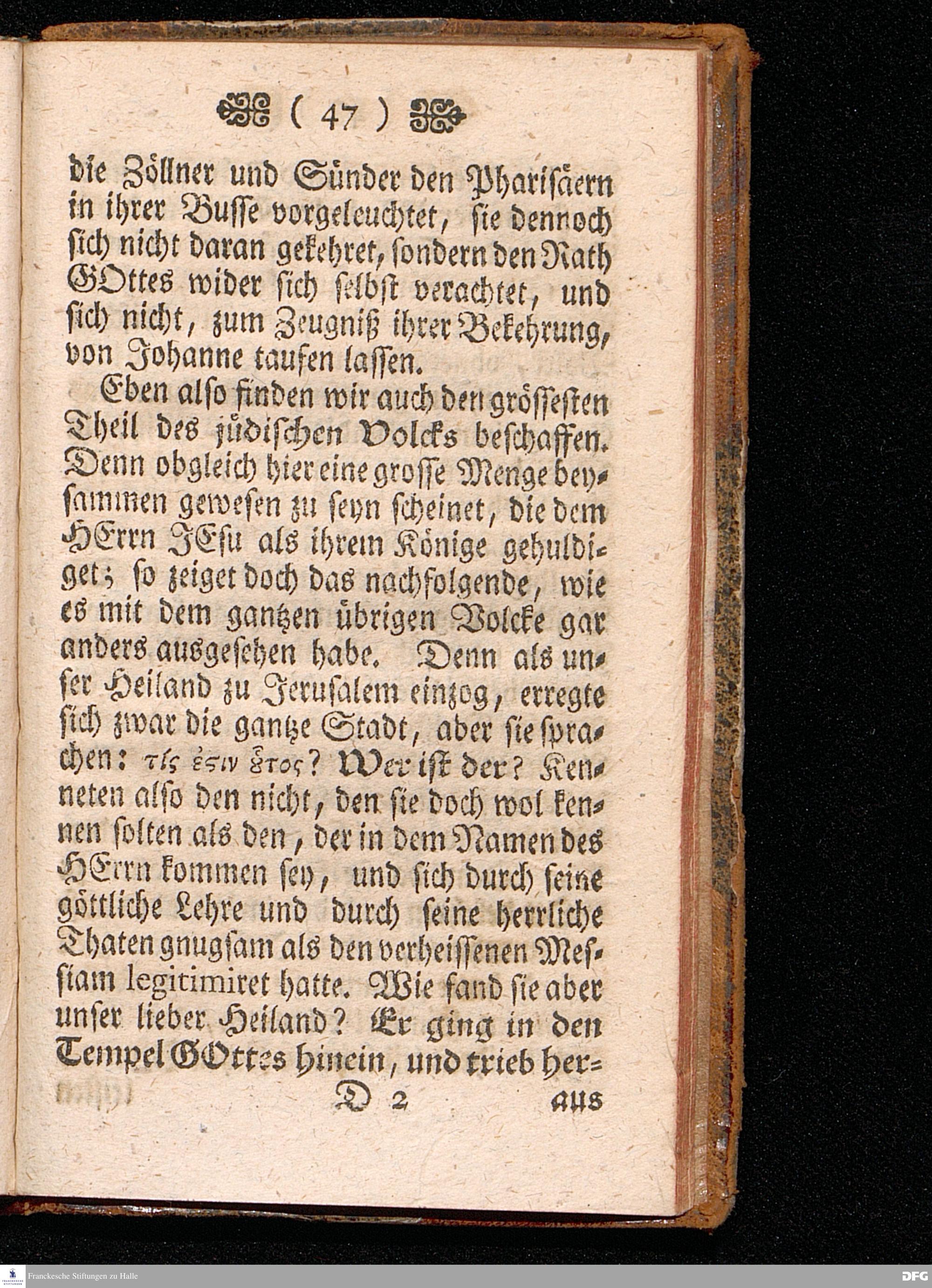 Spiegel der Aufnahme CHRISTI, In dem Exempel derer, die Ihn aufgenommen und nicht aufgenommen haben, Zur Nachfolge und Warnung, Am 1sten Advents=Sonntage A.1717. aus Matth.21, 1==9. In einer auf der Universität Tübingen liebreichst aufgetragenen, und in der Haupt=Kirche daselbst abgelegten Predigt vorgestellet Und auf Erfordern zum Druck gegeben von August Hermann Francken, S.Theol.Professore, Past. und Scholarcha zu Halle im Hertzogthum Magdeb. Vierte Auflage. In Verlegung des Wäysenhauses, 1744.