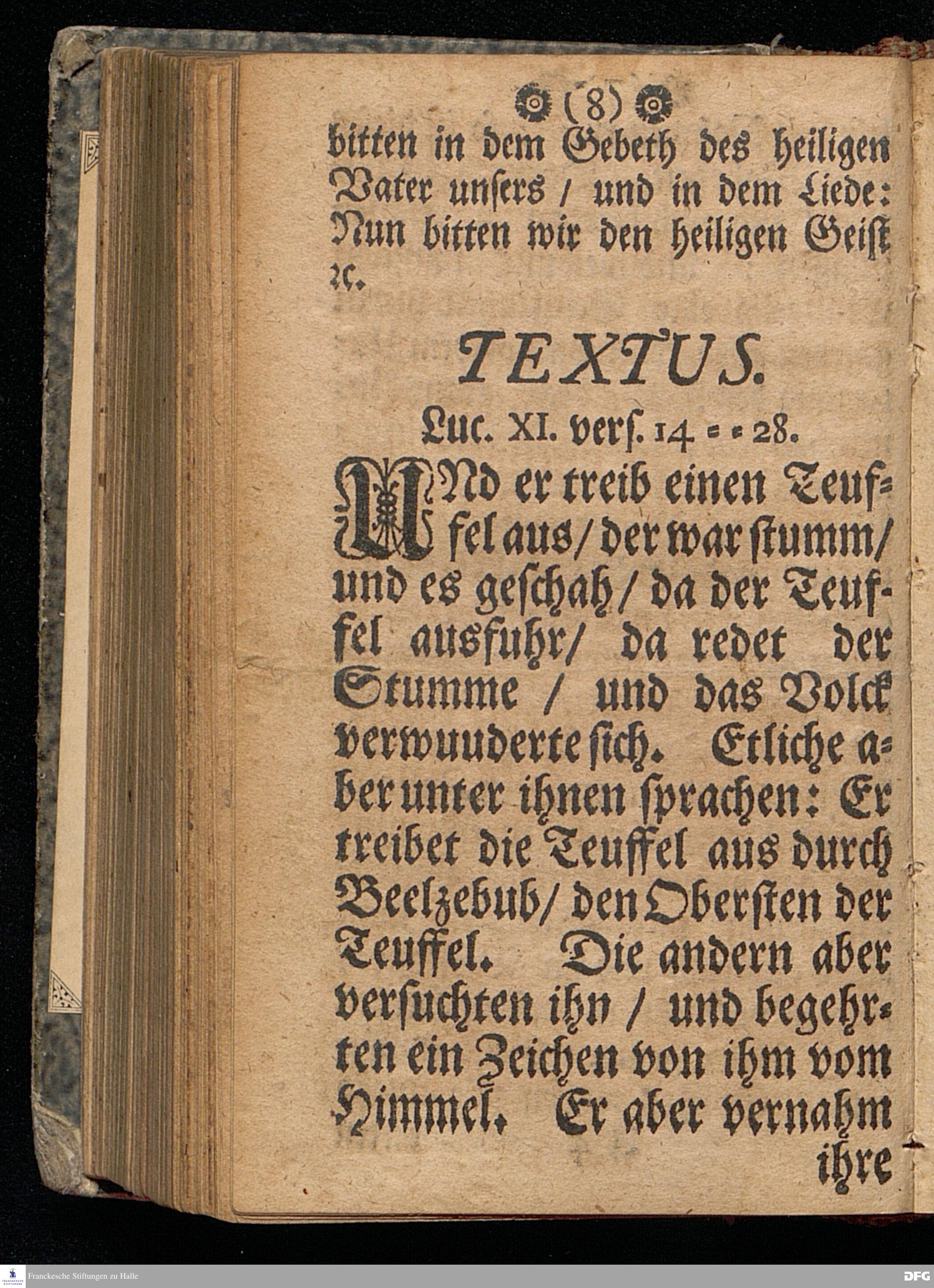 Der Untergang des Reichs des Satans in uns / als ein unbetrügliches Kennzeichen der wahren Bekehrung / Am Sonntag Oculi Anno 1699. In einer Predigt Uber das Evangelium Luc.XI, v.14--28. In der St.Georgen=Kirche zu Glaucha an Halle gehalten Und nunmehro zum andern mahl heraus gegeben von M.August Hermann Francken / S.S.Theol.P.Ord.& Past.Glauch. Halle / druckts Christ.Andreas Zeitler / Univ.Buchdr. 1702.