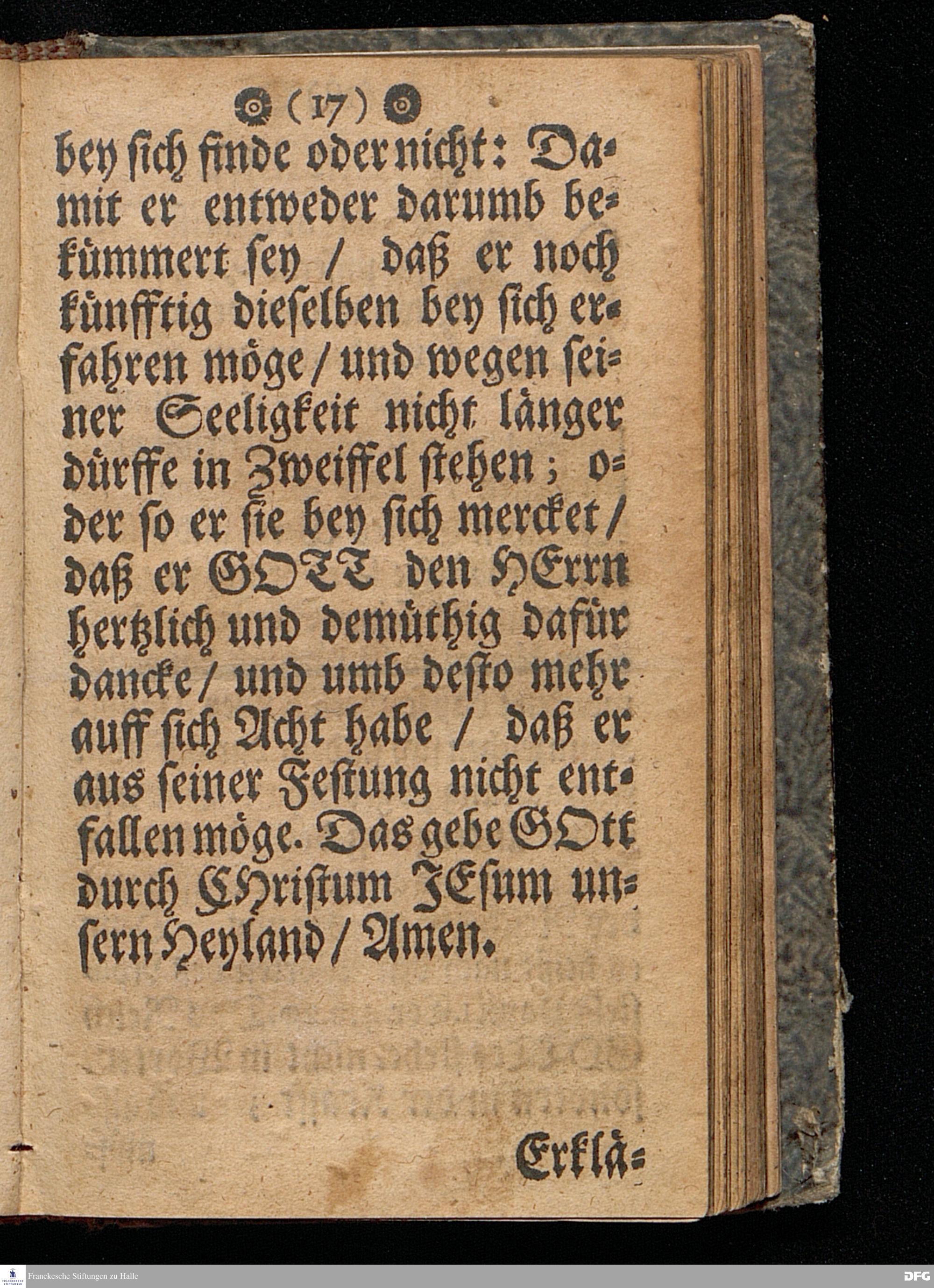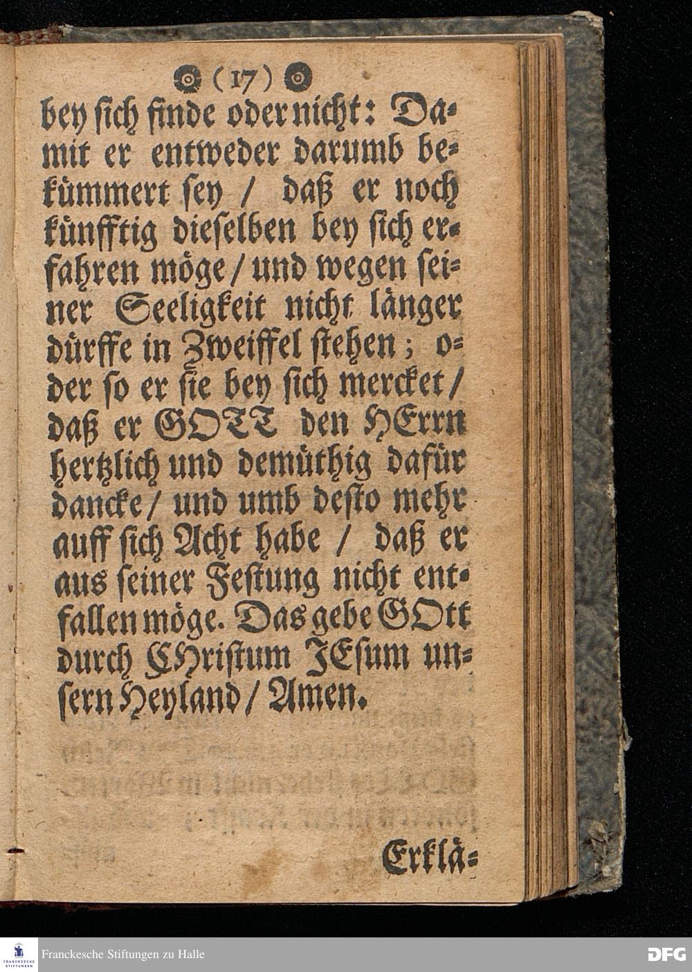 Der Untergang des Reichs des Satans in uns / als ein unbetrügliches Kennzeichen der wahren Bekehrung / Am Sonntag Oculi Anno 1699. In einer Predigt Uber das Evangelium Luc.XI, v.14--28. In der St.Georgen=Kirche zu Glaucha an Halle gehalten Und nunmehro zum andern mahl heraus gegeben von M.August Hermann Francken / S.S.Theol.P.Ord.& Past.Glauch. Halle / druckts Christ.Andreas Zeitler / Univ.Buchdr. 1702.