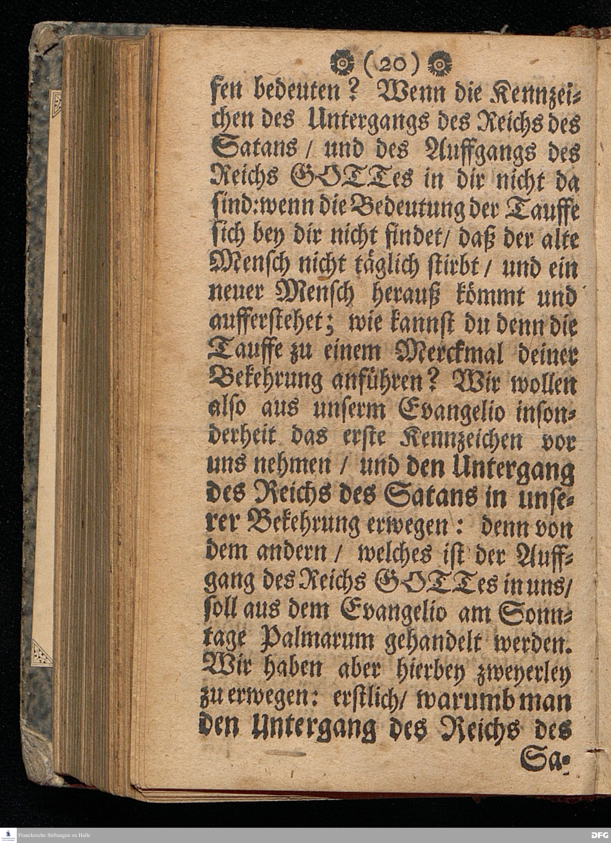 Der Untergang des Reichs des Satans in uns / als ein unbetrügliches Kennzeichen der wahren Bekehrung / Am Sonntag Oculi Anno 1699. In einer Predigt Uber das Evangelium Luc.XI, v.14--28. In der St.Georgen=Kirche zu Glaucha an Halle gehalten Und nunmehro zum andern mahl heraus gegeben von M.August Hermann Francken / S.S.Theol.P.Ord.& Past.Glauch. Halle / druckts Christ.Andreas Zeitler / Univ.Buchdr. 1702.