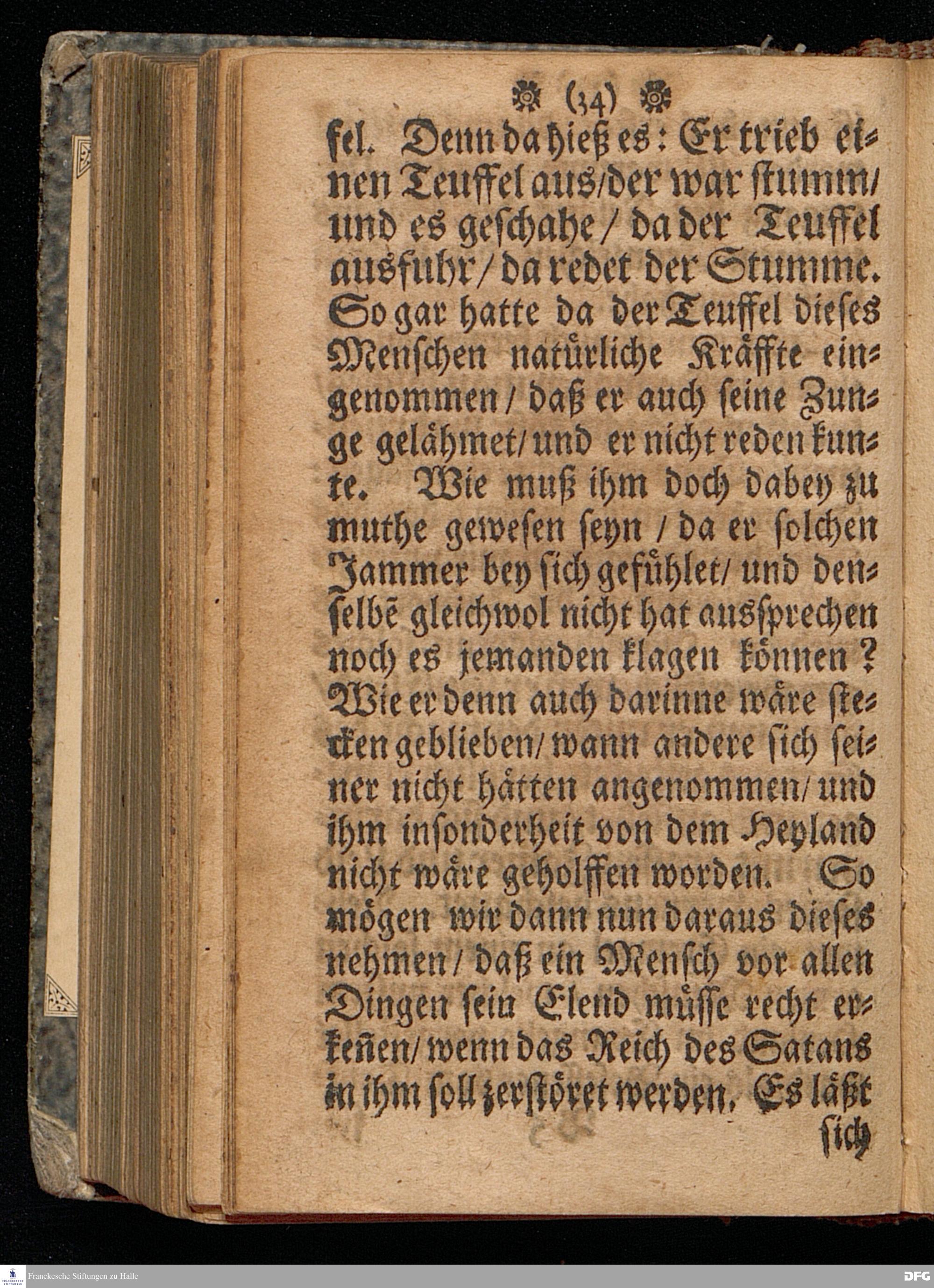 Der Untergang des Reichs des Satans in uns / als ein unbetrügliches Kennzeichen der wahren Bekehrung / Am Sonntag Oculi Anno 1699. In einer Predigt Uber das Evangelium Luc.XI, v.14--28. In der St.Georgen=Kirche zu Glaucha an Halle gehalten Und nunmehro zum andern mahl heraus gegeben von M.August Hermann Francken / S.S.Theol.P.Ord.& Past.Glauch. Halle / druckts Christ.Andreas Zeitler / Univ.Buchdr. 1702.