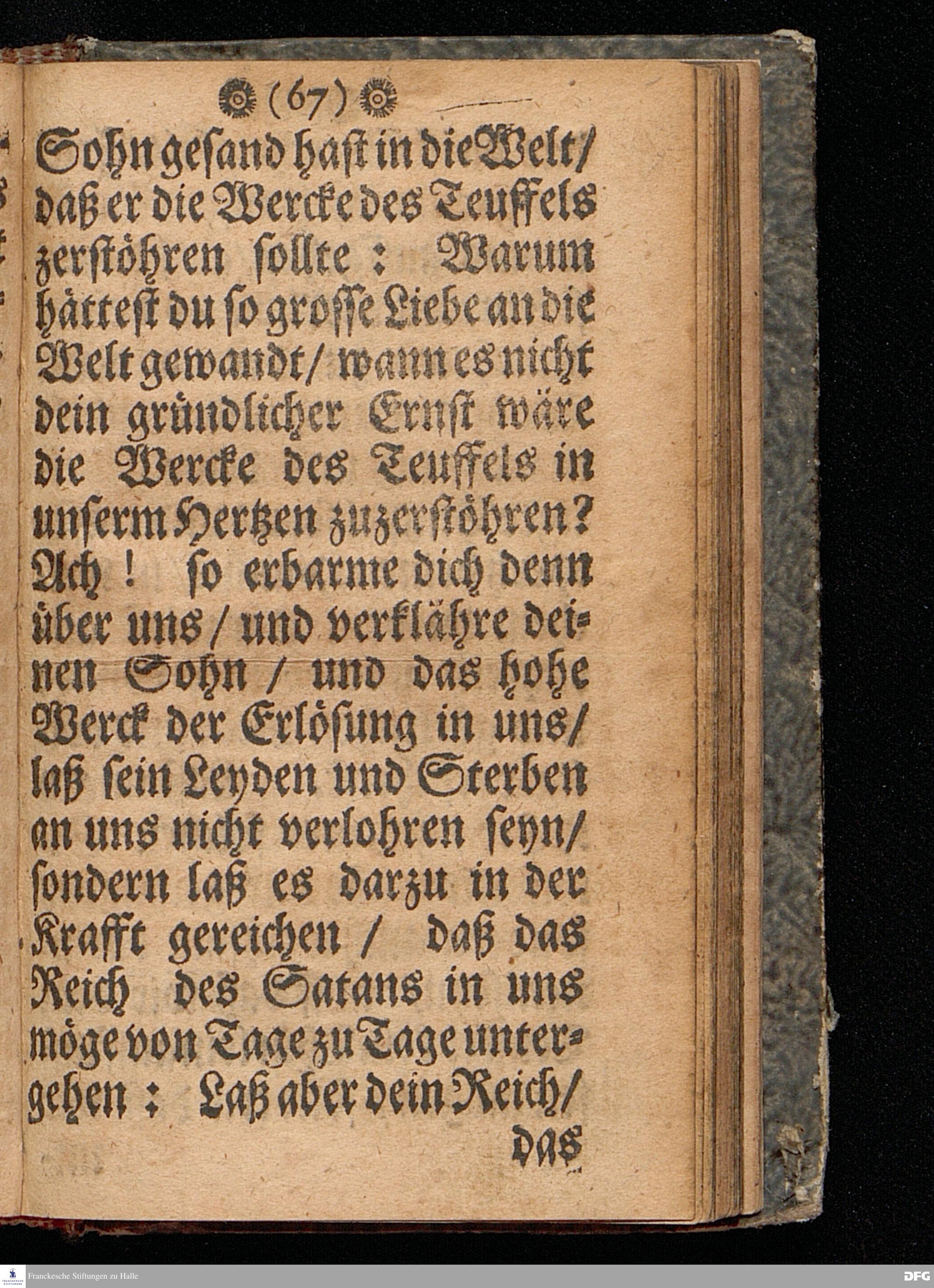 Der Untergang des Reichs des Satans in uns / als ein unbetrügliches Kennzeichen der wahren Bekehrung / Am Sonntag Oculi Anno 1699. In einer Predigt Uber das Evangelium Luc.XI, v.14--28. In der St.Georgen=Kirche zu Glaucha an Halle gehalten Und nunmehro zum andern mahl heraus gegeben von M.August Hermann Francken / S.S.Theol.P.Ord.& Past.Glauch. Halle / druckts Christ.Andreas Zeitler / Univ.Buchdr. 1702.