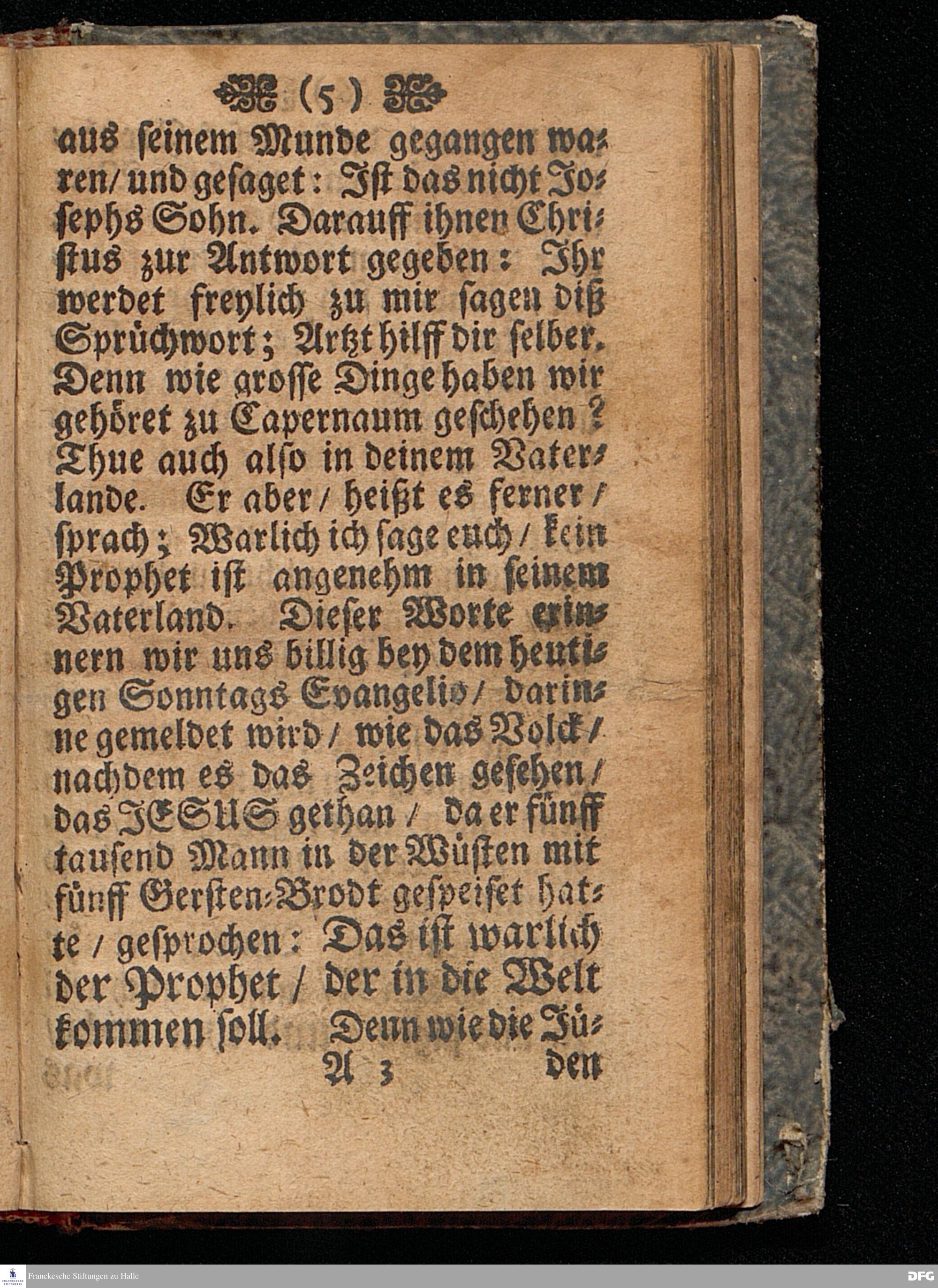 Der Wahre Prophet wer er sey / und wie er zu finden / Am Sonntage Lætare Anno 1699. In einer Predigt Uber das Evangelium Joh.VI, v.1--15. In der St.Georgen=Kirche zu Glaucha an Halle vorgestellet Und nunmehro zum andern mahl herausgegeben von M.August Hermann Francken / S.S.Theol.P.Ord.& Past.Glauch. HALLE / Gedruckt bey Christian Henckeln / 1702.