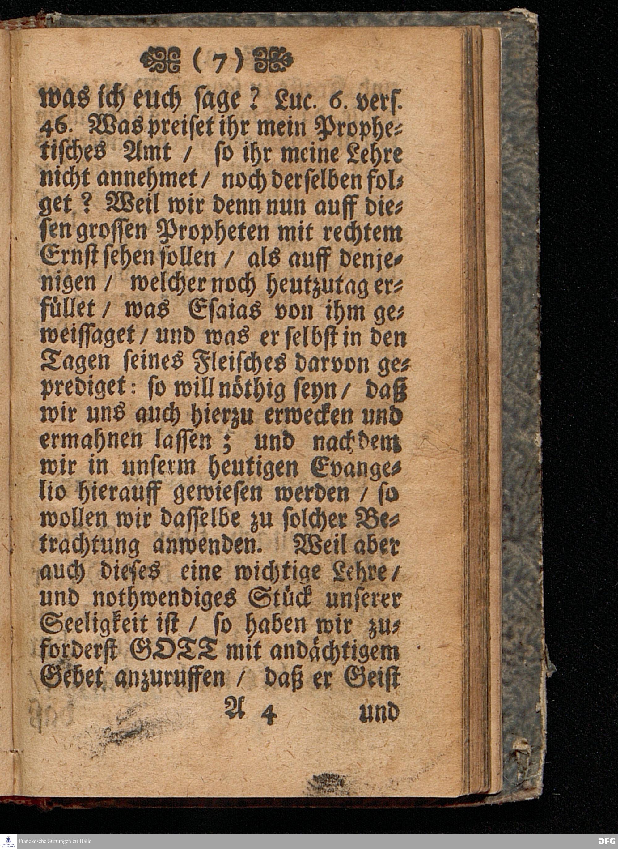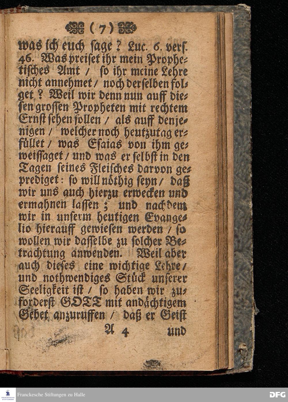 Der Wahre Prophet wer er sey / und wie er zu finden / Am Sonntage Lætare Anno 1699. In einer Predigt Uber das Evangelium Joh.VI, v.1--15. In der St.Georgen=Kirche zu Glaucha an Halle vorgestellet Und nunmehro zum andern mahl herausgegeben von M.August Hermann Francken / S.S.Theol.P.Ord.& Past.Glauch. HALLE / Gedruckt bey Christian Henckeln / 1702.