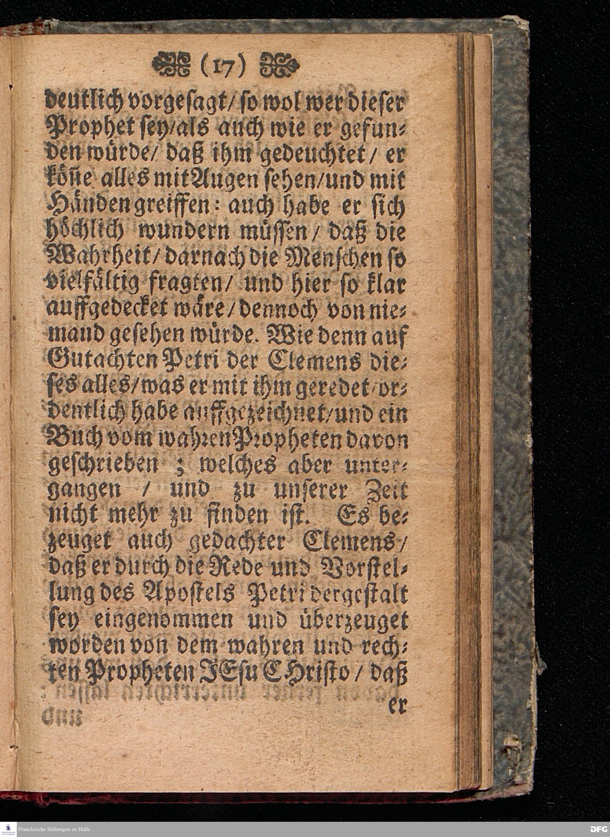 Der Wahre Prophet wer er sey / und wie er zu finden / Am Sonntage Lætare Anno 1699. In einer Predigt Uber das Evangelium Joh.VI, v.1--15. In der St.Georgen=Kirche zu Glaucha an Halle vorgestellet Und nunmehro zum andern mahl herausgegeben von M.August Hermann Francken / S.S.Theol.P.Ord.& Past.Glauch. HALLE / Gedruckt bey Christian Henckeln / 1702.