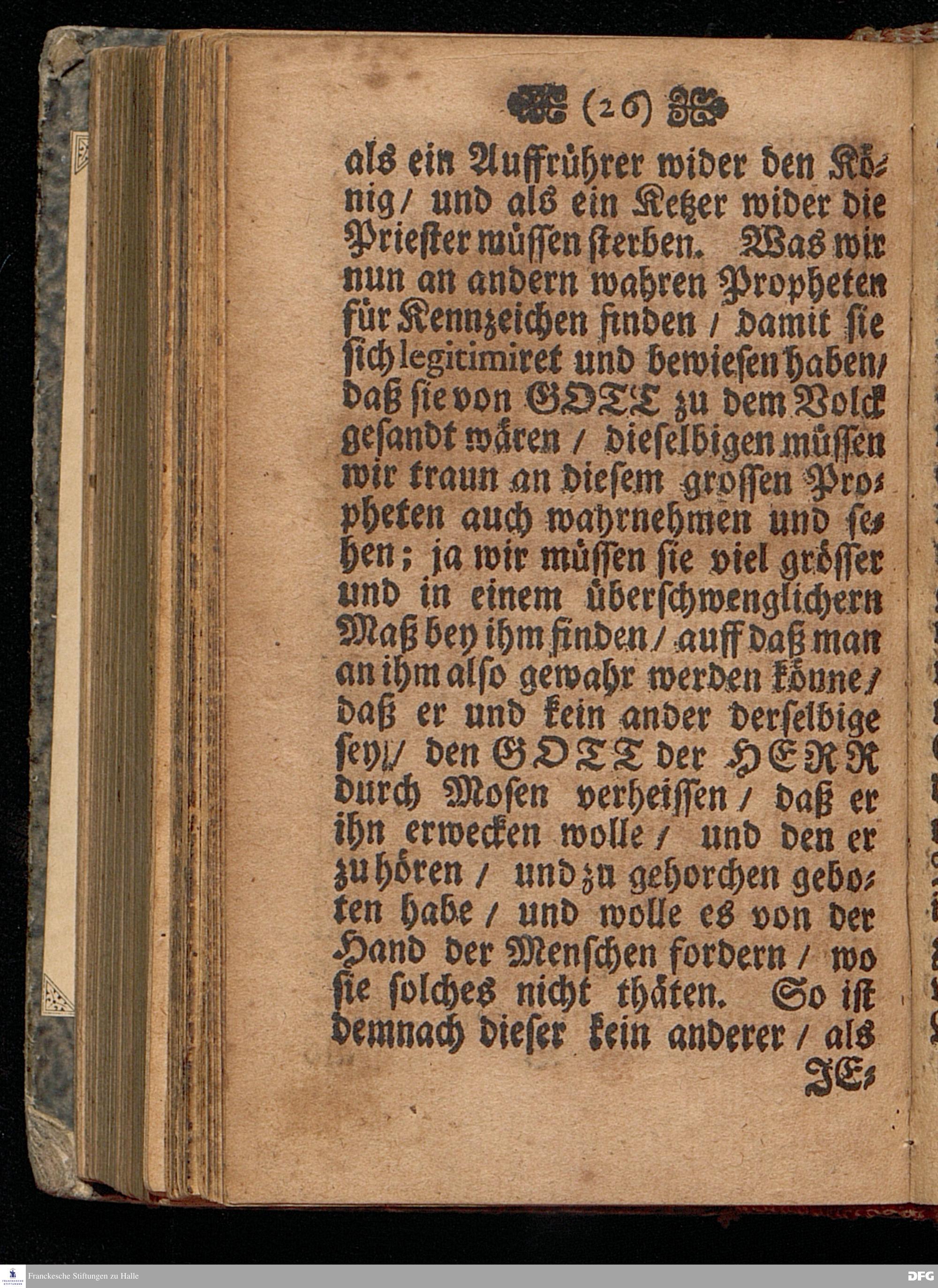 Der Wahre Prophet wer er sey / und wie er zu finden / Am Sonntage Lætare Anno 1699. In einer Predigt Uber das Evangelium Joh.VI, v.1--15. In der St.Georgen=Kirche zu Glaucha an Halle vorgestellet Und nunmehro zum andern mahl herausgegeben von M.August Hermann Francken / S.S.Theol.P.Ord.& Past.Glauch. HALLE / Gedruckt bey Christian Henckeln / 1702.
