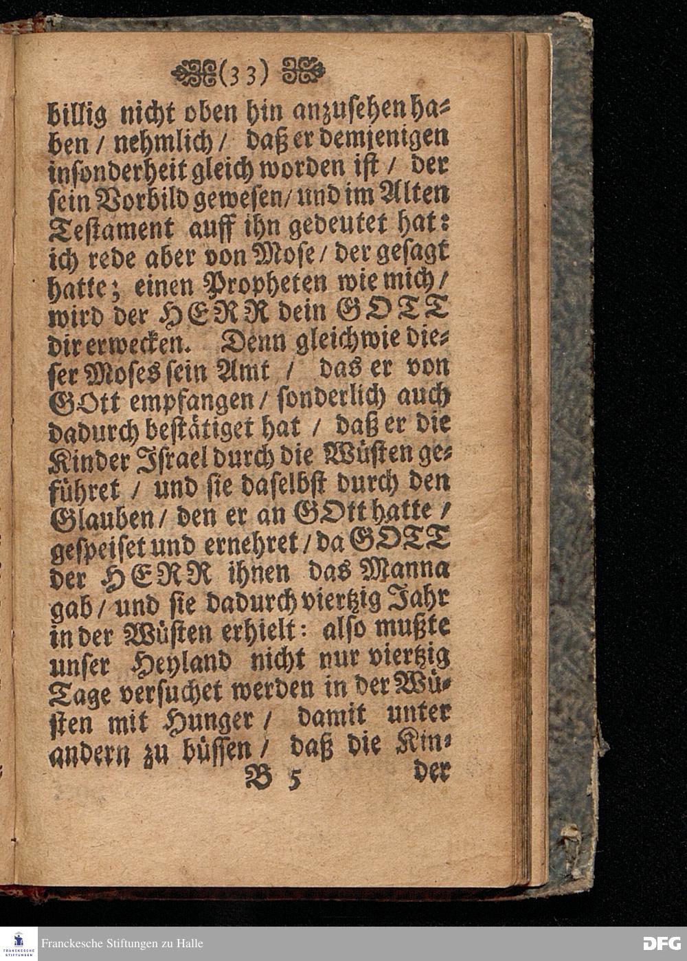 Der Wahre Prophet wer er sey / und wie er zu finden / Am Sonntage Lætare Anno 1699. In einer Predigt Uber das Evangelium Joh.VI, v.1--15. In der St.Georgen=Kirche zu Glaucha an Halle vorgestellet Und nunmehro zum andern mahl herausgegeben von M.August Hermann Francken / S.S.Theol.P.Ord.& Past.Glauch. HALLE / Gedruckt bey Christian Henckeln / 1702.