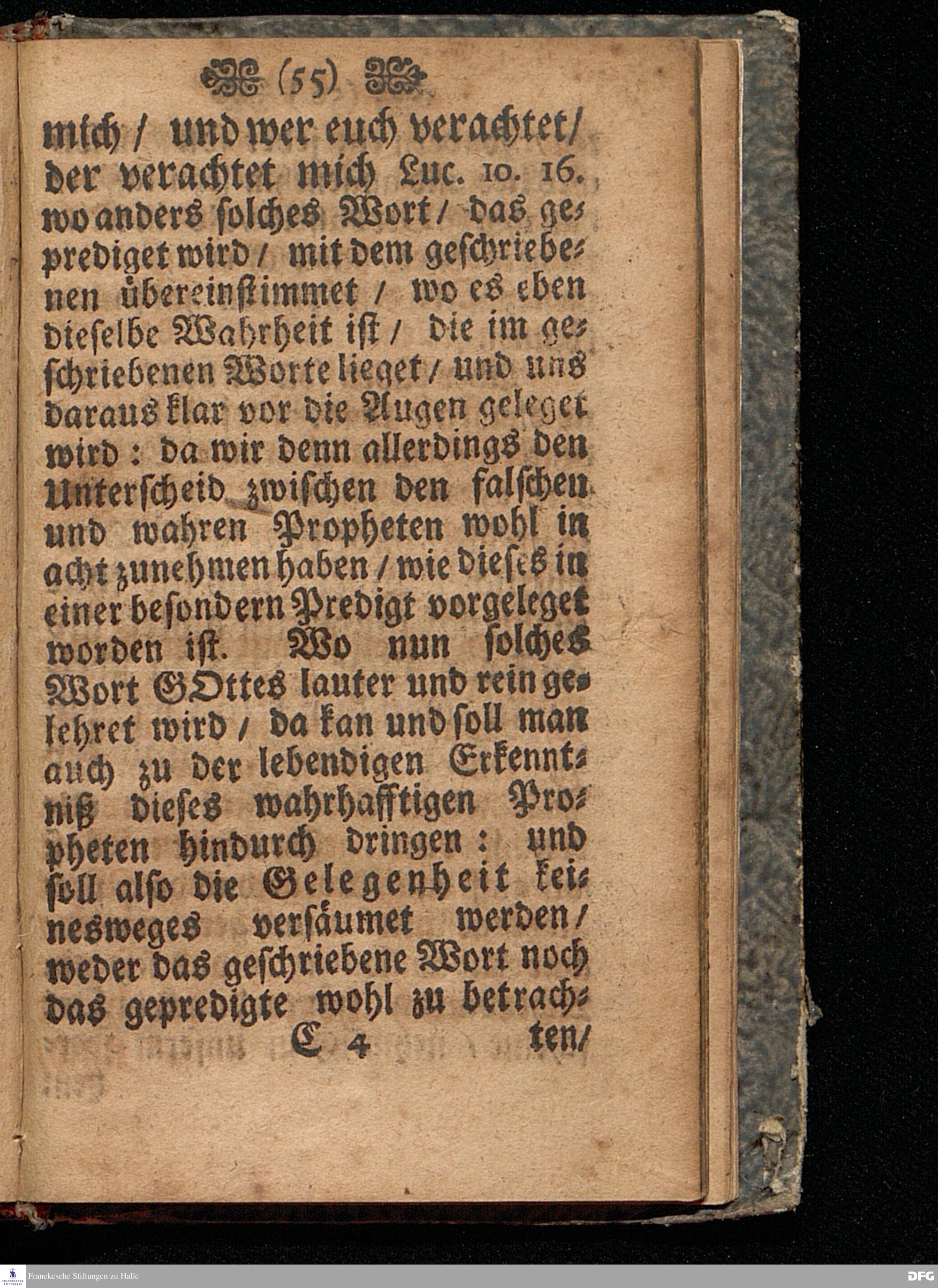 Der Wahre Prophet wer er sey / und wie er zu finden / Am Sonntage Lætare Anno 1699. In einer Predigt Uber das Evangelium Joh.VI, v.1--15. In der St.Georgen=Kirche zu Glaucha an Halle vorgestellet Und nunmehro zum andern mahl herausgegeben von M.August Hermann Francken / S.S.Theol.P.Ord.& Past.Glauch. HALLE / Gedruckt bey Christian Henckeln / 1702.