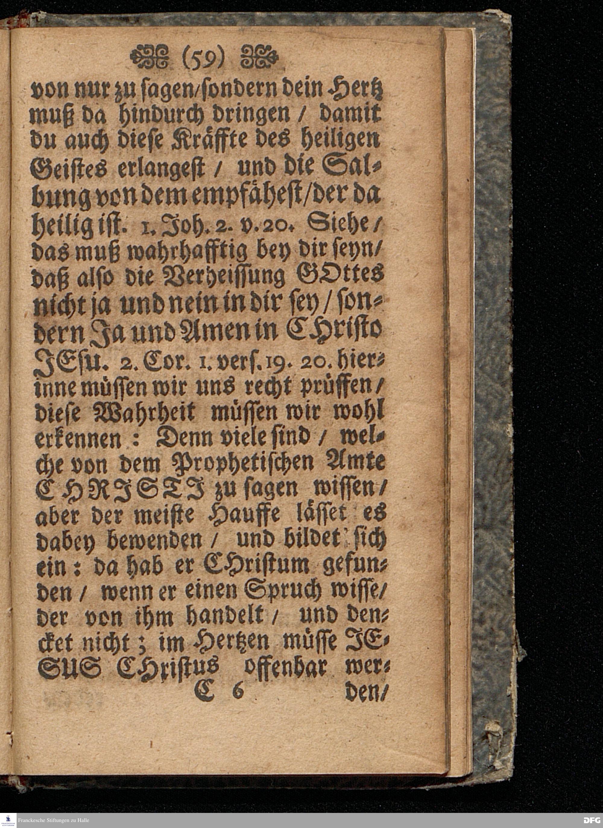 Der Wahre Prophet wer er sey / und wie er zu finden / Am Sonntage Lætare Anno 1699. In einer Predigt Uber das Evangelium Joh.VI, v.1--15. In der St.Georgen=Kirche zu Glaucha an Halle vorgestellet Und nunmehro zum andern mahl herausgegeben von M.August Hermann Francken / S.S.Theol.P.Ord.& Past.Glauch. HALLE / Gedruckt bey Christian Henckeln / 1702.