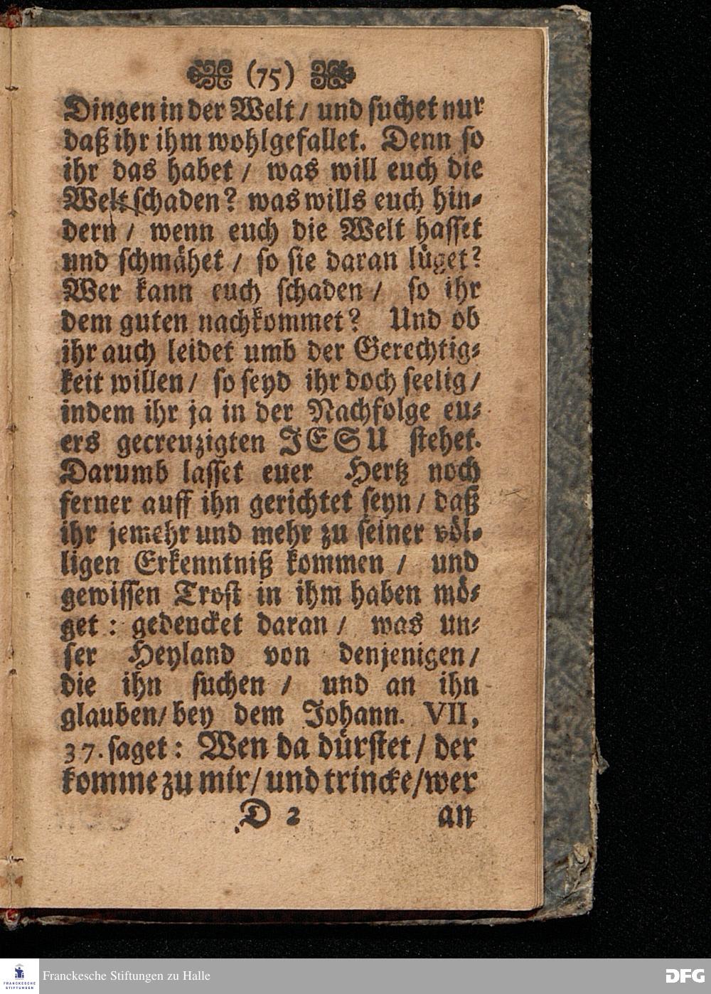 Der Wahre Prophet wer er sey / und wie er zu finden / Am Sonntage Lætare Anno 1699. In einer Predigt Uber das Evangelium Joh.VI, v.1--15. In der St.Georgen=Kirche zu Glaucha an Halle vorgestellet Und nunmehro zum andern mahl herausgegeben von M.August Hermann Francken / S.S.Theol.P.Ord.& Past.Glauch. HALLE / Gedruckt bey Christian Henckeln / 1702.