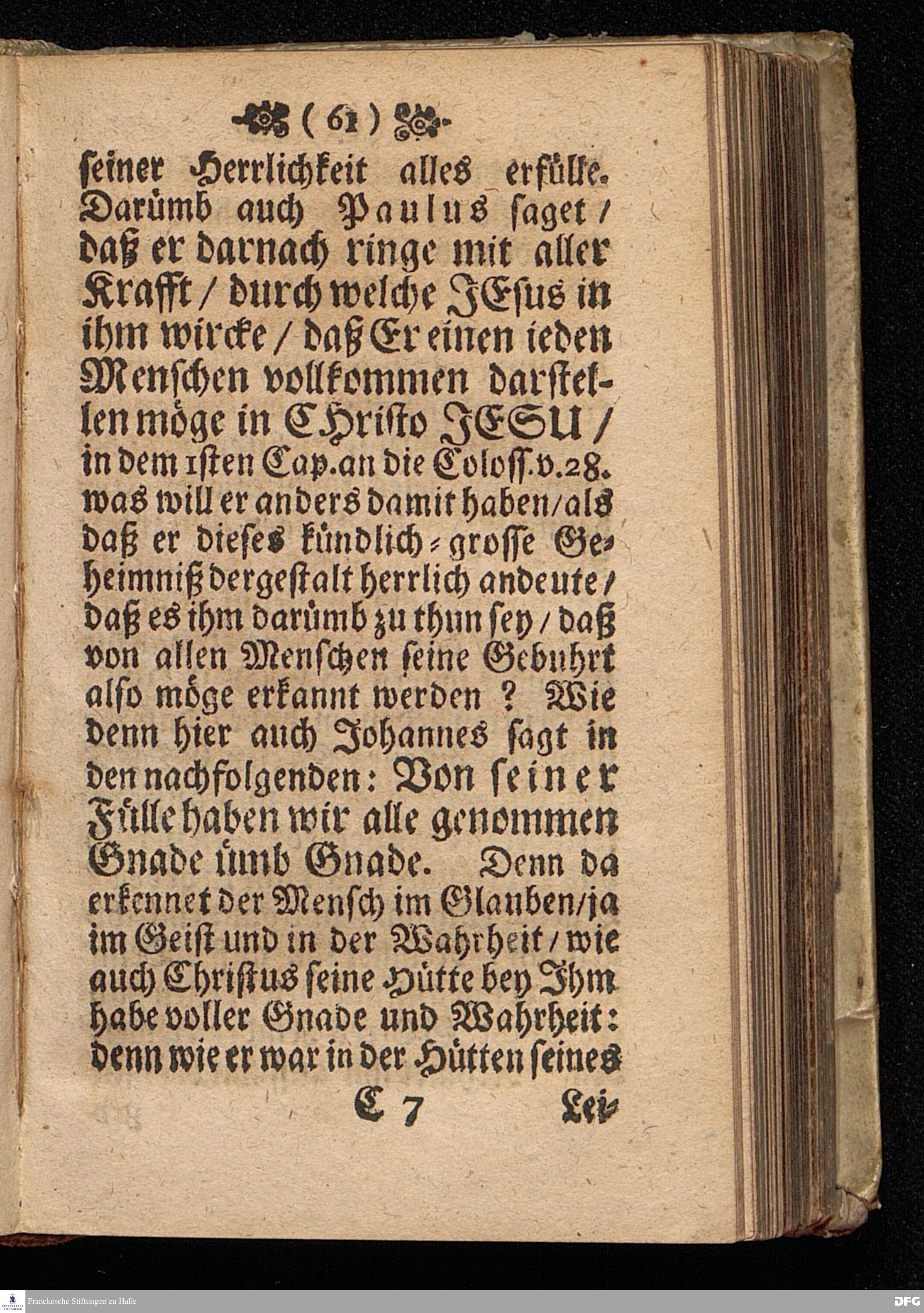 Das Kündlich=große Geheimniß Der Gottseeligkeit / Am dritten Weyhenacht=Feyertage ANNO 1698. In einer Predigt Uber das Evangelium Joh.I, 1--14. In der St. Georgen=Kirche zu Glaucha an Halle / vorgestellet von M. August Hermann Francken / SS.Theol.Gr.& OO.LL.P.P.Ord.& P.Glauch. HALLE / Gedruckt bey Christ.Henckel / 1699.