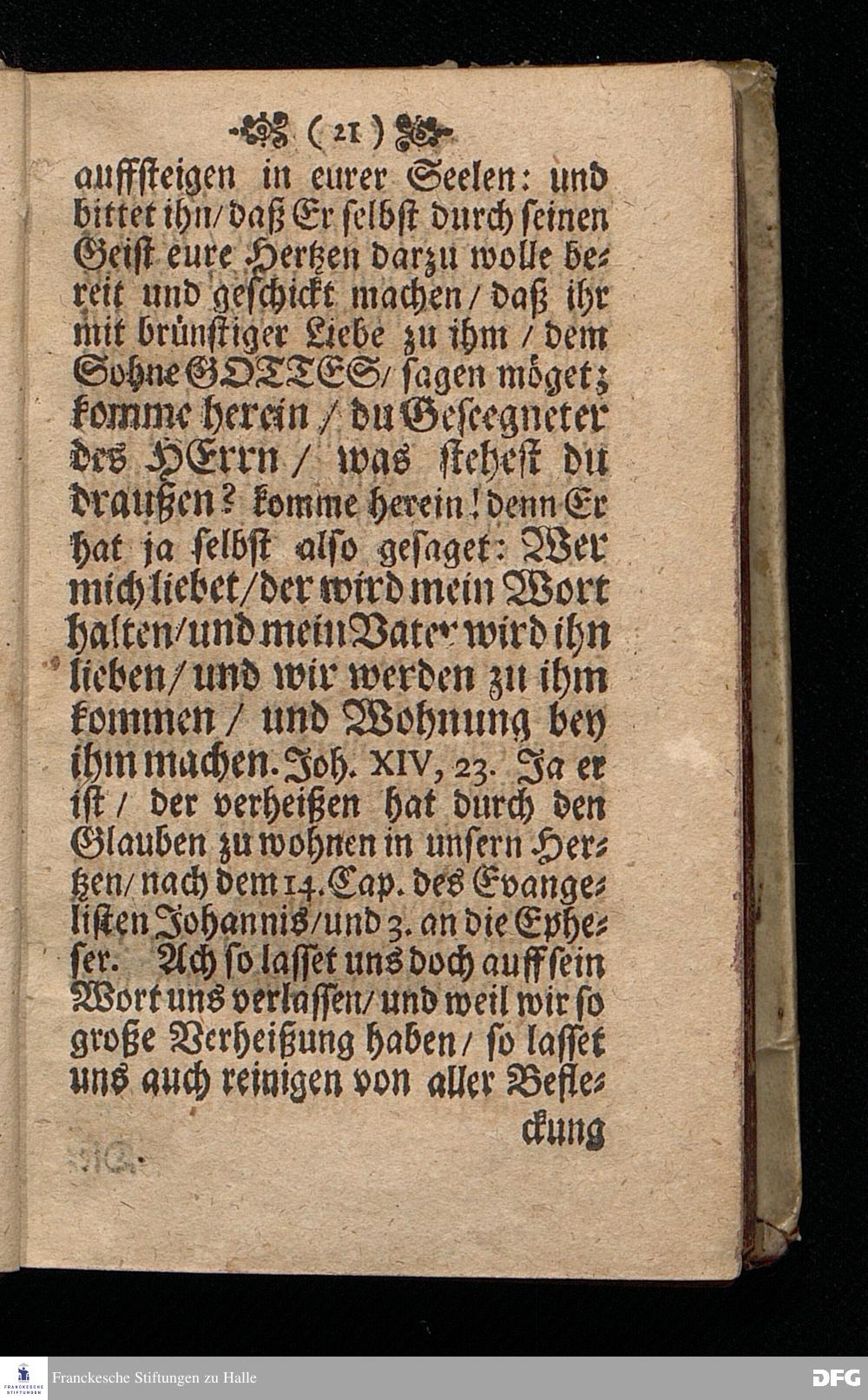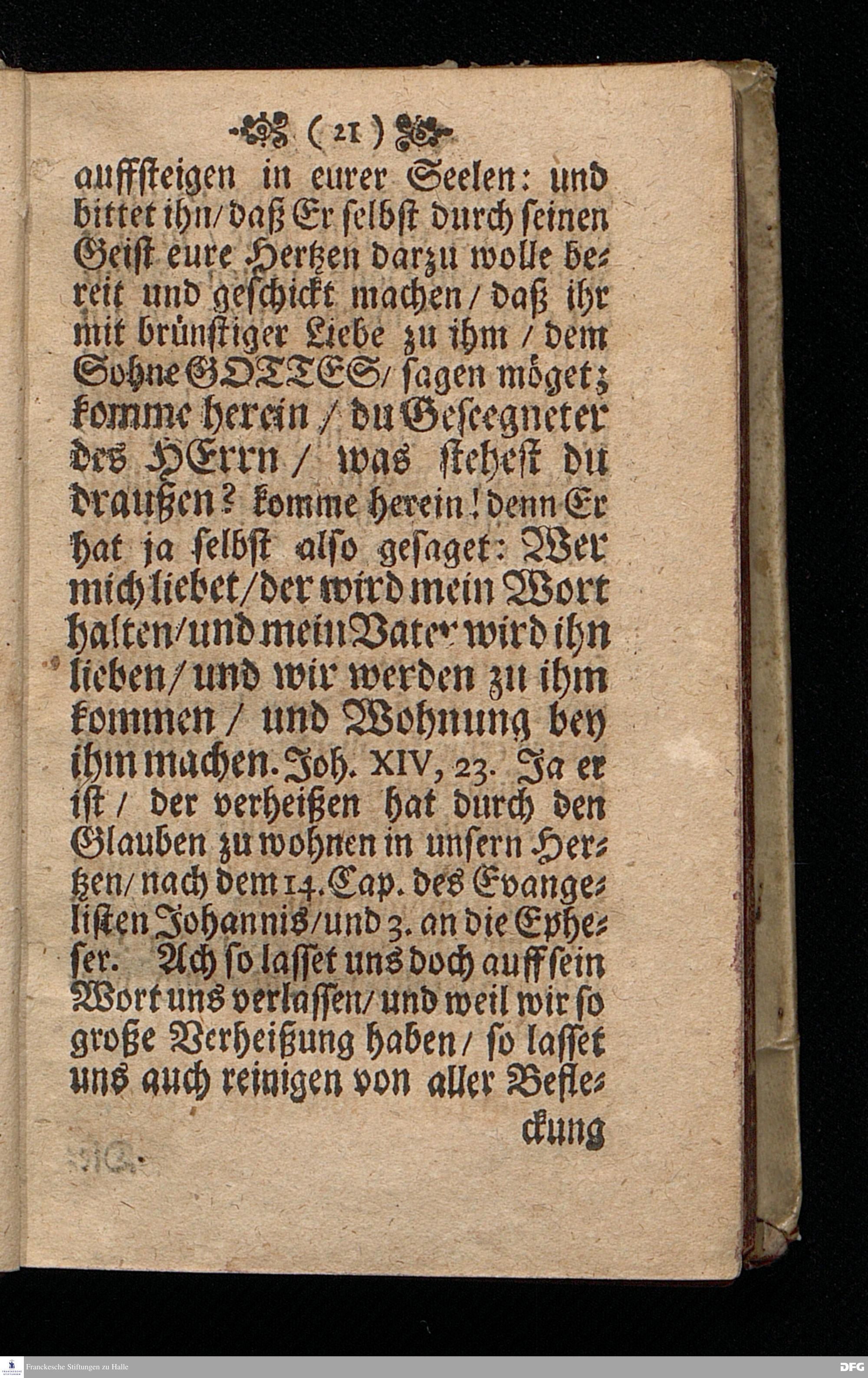 Das Hosianna / Als Ein Wort des Gebets / des Lobes und der Erweckung / Am ersten Soñtag des Advents Anno 1698, Uber das Evangelium Matth.XXI, 1==9, In der St.Georgen=Kirche zu Glaucha an Halle vorgestellet von M.August Hermann Francken / SS.Theol.Gr.& OO.LL.PP.Ord.& P.Glauch. HALLE / Gedruckt bey Christ.Henckel / 1699.