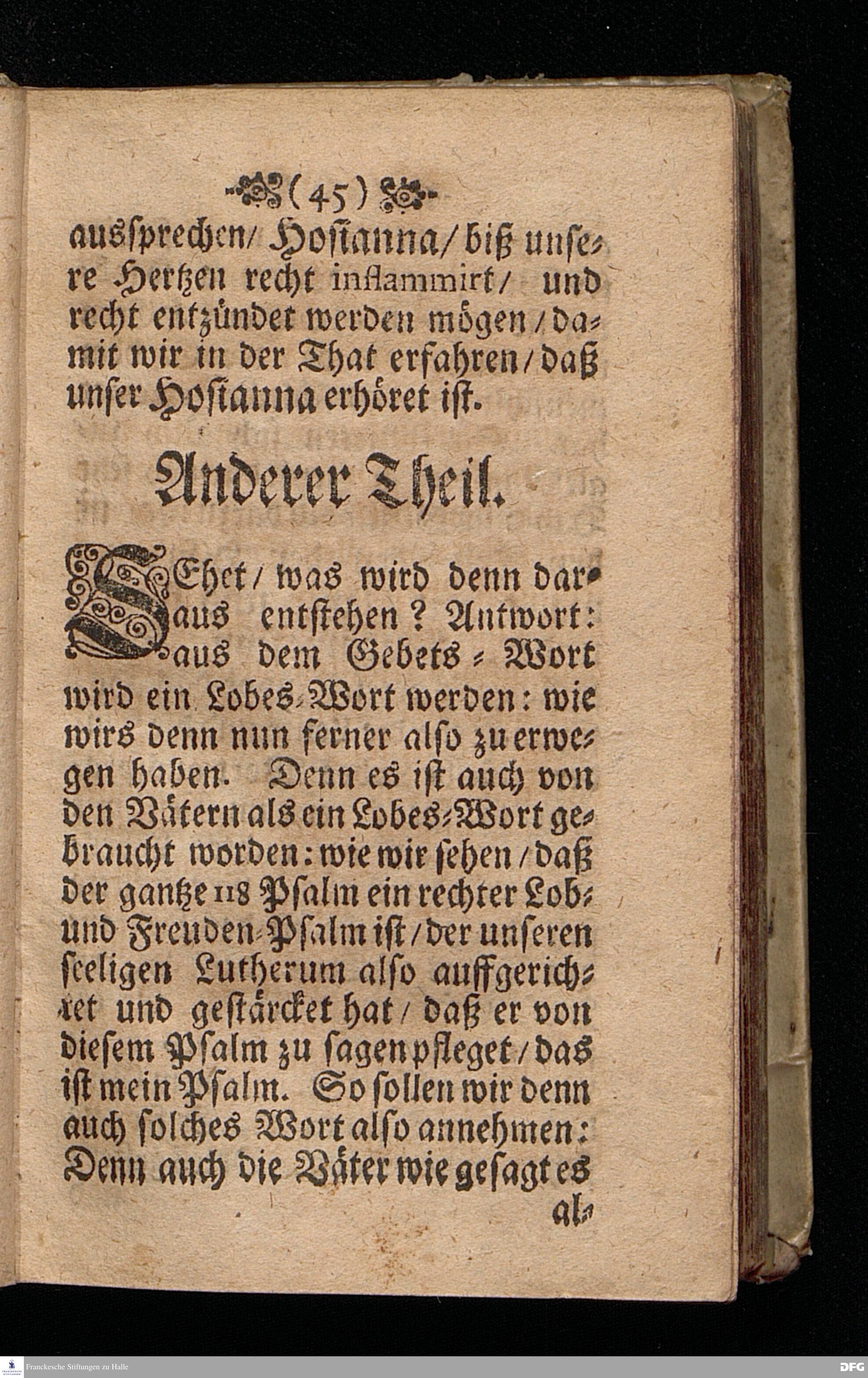 Das Hosianna / Als Ein Wort des Gebets / des Lobes und der Erweckung / Am ersten Soñtag des Advents Anno 1698, Uber das Evangelium Matth.XXI, 1==9, In der St.Georgen=Kirche zu Glaucha an Halle vorgestellet von M.August Hermann Francken / SS.Theol.Gr.& OO.LL.PP.Ord.& P.Glauch. HALLE / Gedruckt bey Christ.Henckel / 1699.