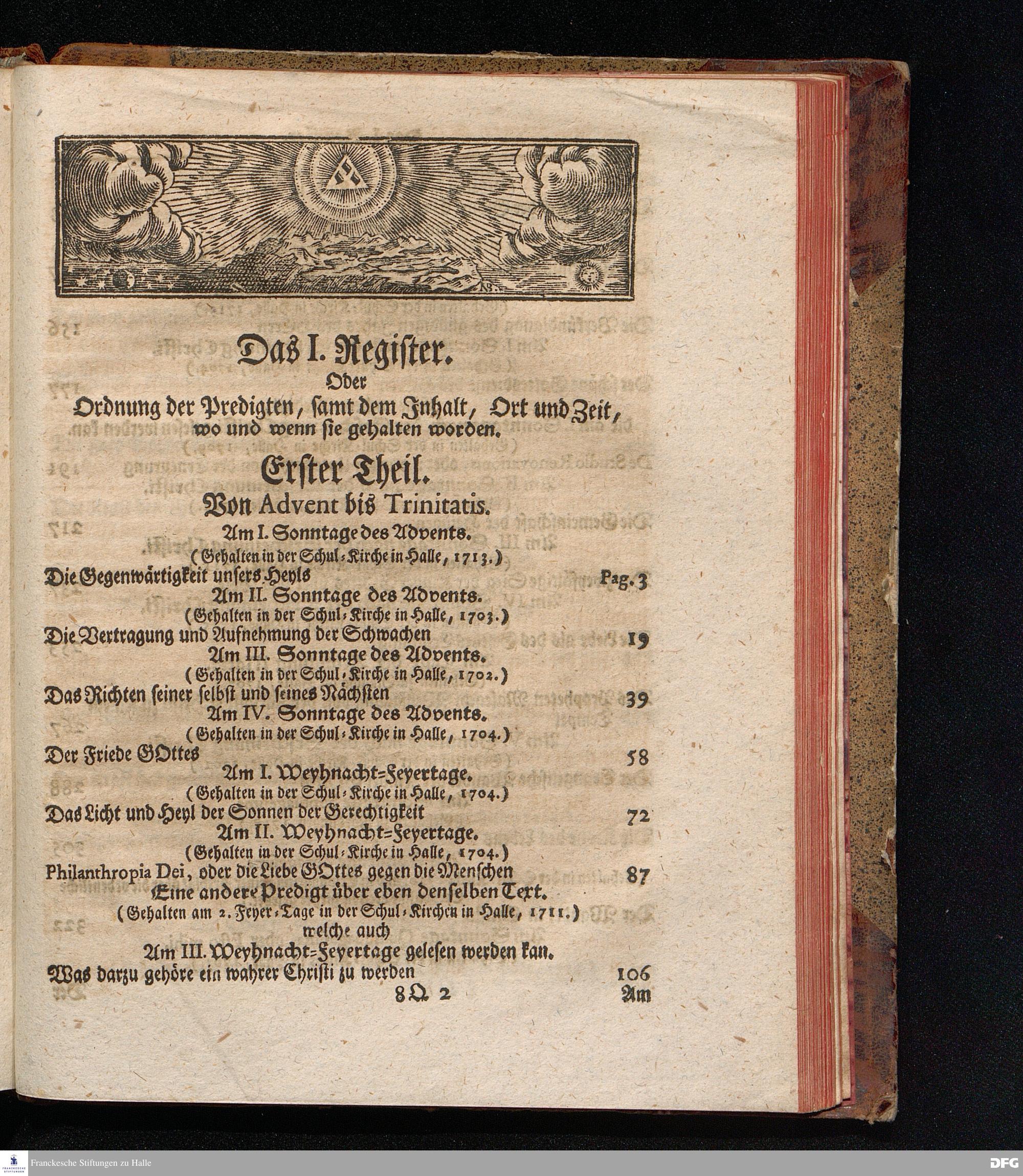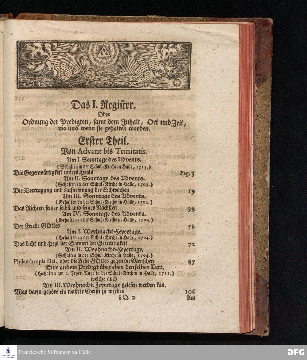 August Hermann Franckens, S.Theol.Prof.Past.Ulric.& Scholarchæ Predigten über die Sonn= und Fest=Tags=Episteln / Nebst einer Vorrede vom erbaulichen predigen, und von dem rechten Gebrauch dieser Predigten, auch Mit nöthigen Registern versehen. Die dritte EDITION. HALLE, in Verlegung des Wäysen=Hauses, MDCCXXXXI.