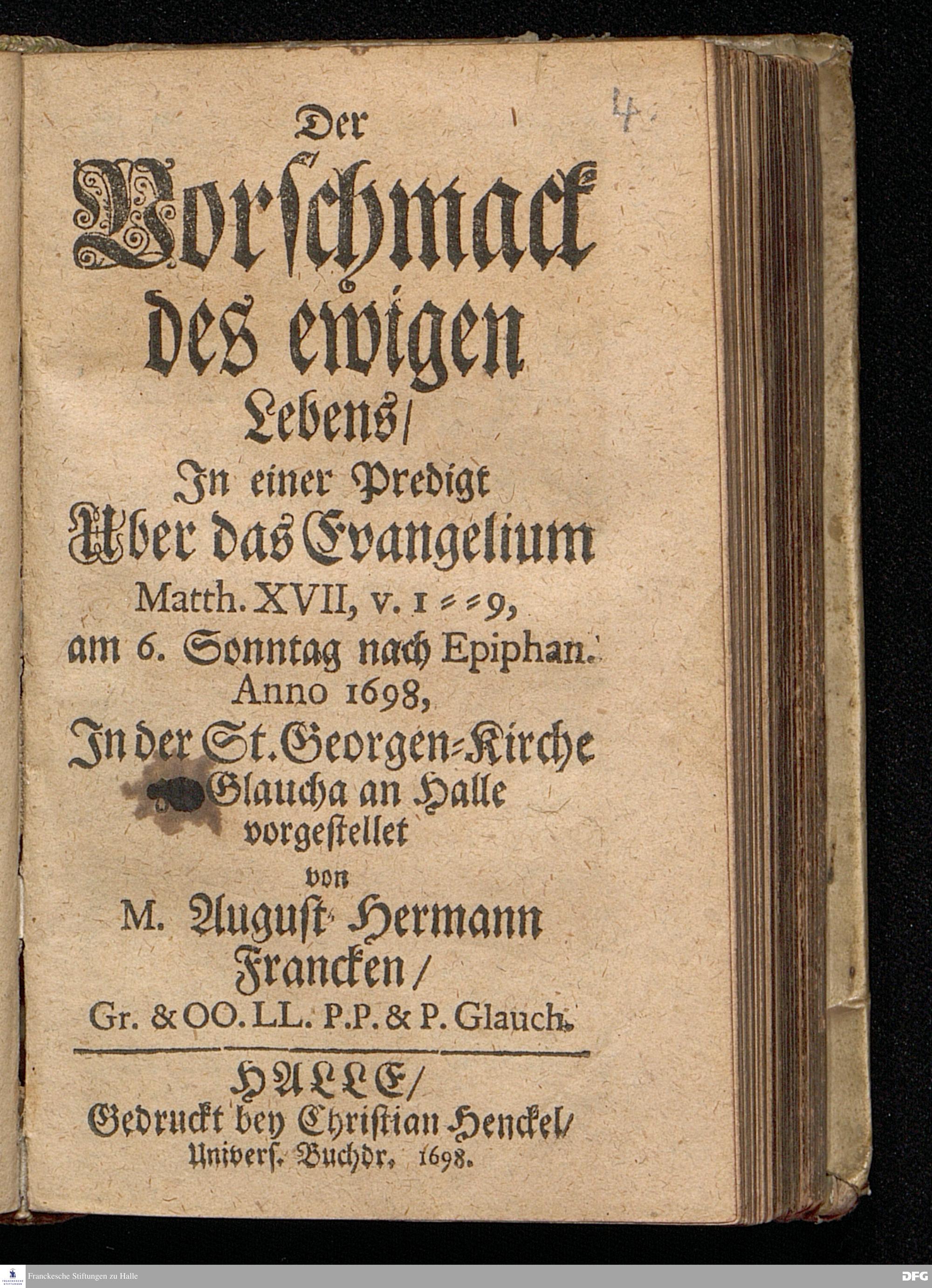 Der Vorschmack des ewigen Lebens / In einer Predigt Uber das Evangelium Matth.XVII, v.1==9, am 6.Sonntag nach Epiphan. Anno 1698, In der St.Georgen=Kirche zu Glaucha an Halle vorgestellet von M.August Hermann Francken / Gr.& OO.LL.P.P.& P.Glauch. HALLE / Gedruckt bey Christian Henckel / Univers.Buchdr.1698.