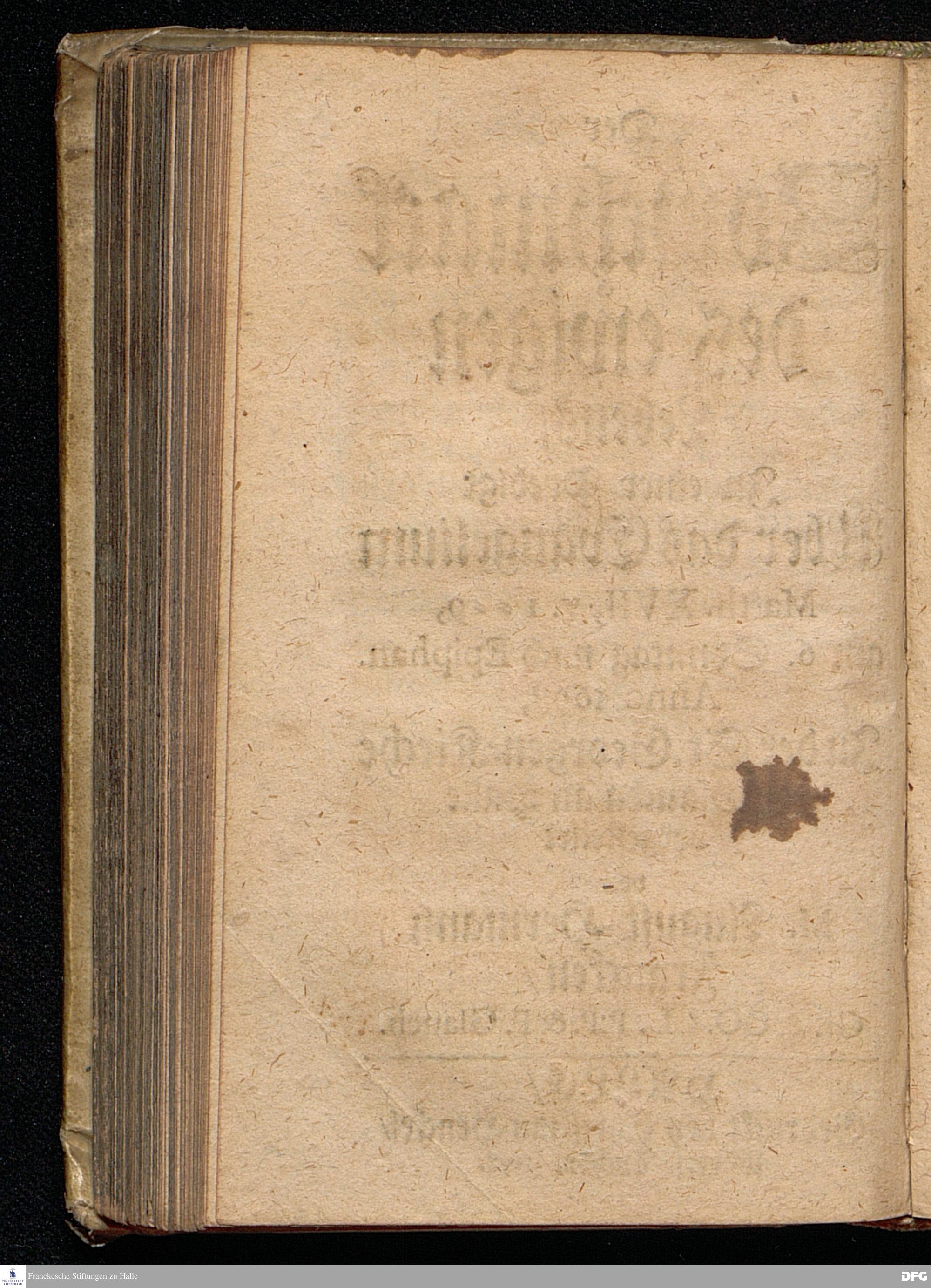 Der Vorschmack des ewigen Lebens / In einer Predigt Uber das Evangelium Matth.XVII, v.1==9, am 6.Sonntag nach Epiphan. Anno 1698, In der St.Georgen=Kirche zu Glaucha an Halle vorgestellet von M.August Hermann Francken / Gr.& OO.LL.P.P.& P.Glauch. HALLE / Gedruckt bey Christian Henckel / Univers.Buchdr.1698.