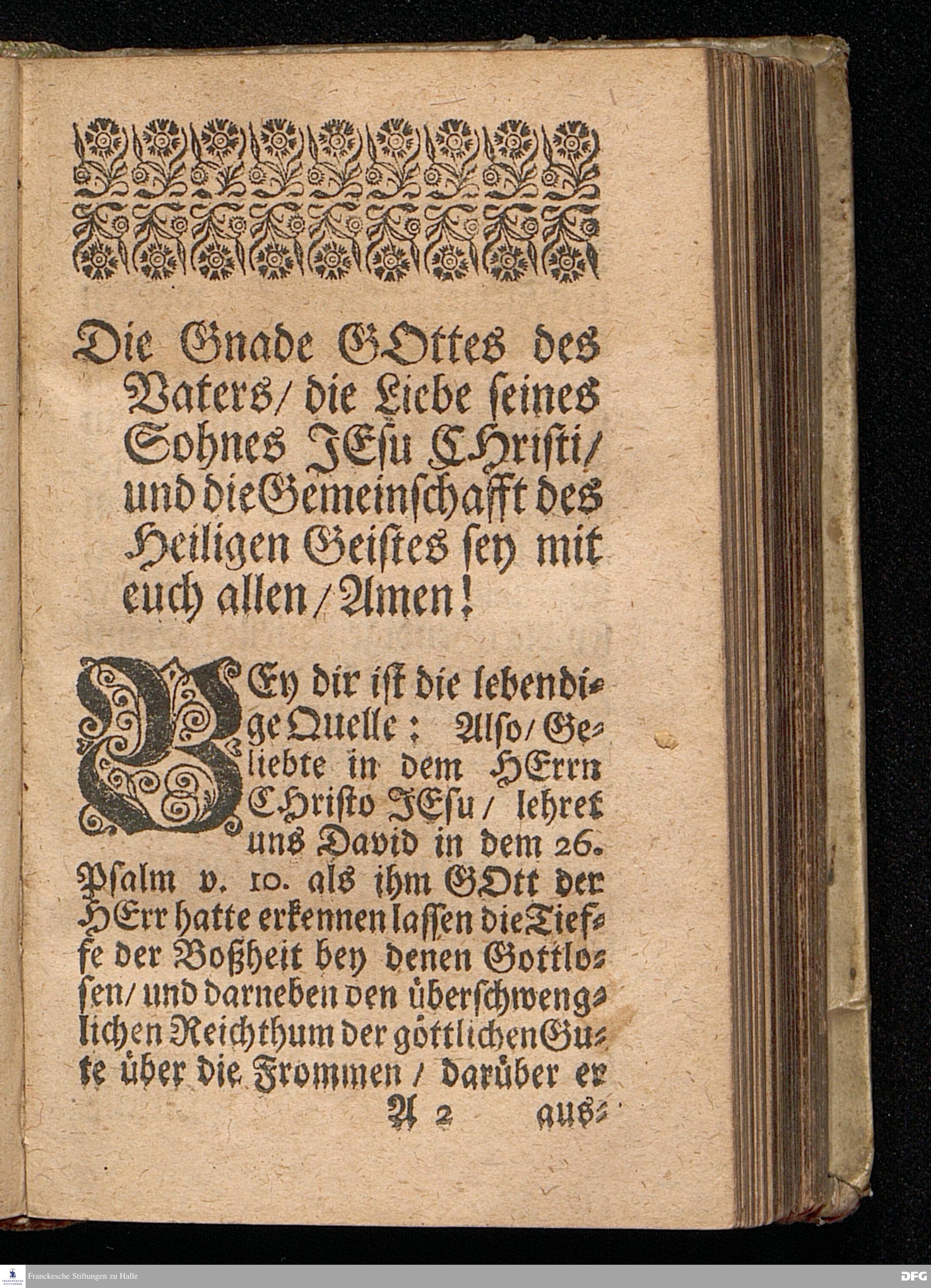 Der Vorschmack des ewigen Lebens / In einer Predigt Uber das Evangelium Matth.XVII, v.1==9, am 6.Sonntag nach Epiphan. Anno 1698, In der St.Georgen=Kirche zu Glaucha an Halle vorgestellet von M.August Hermann Francken / Gr.& OO.LL.P.P.& P.Glauch. HALLE / Gedruckt bey Christian Henckel / Univers.Buchdr.1698.