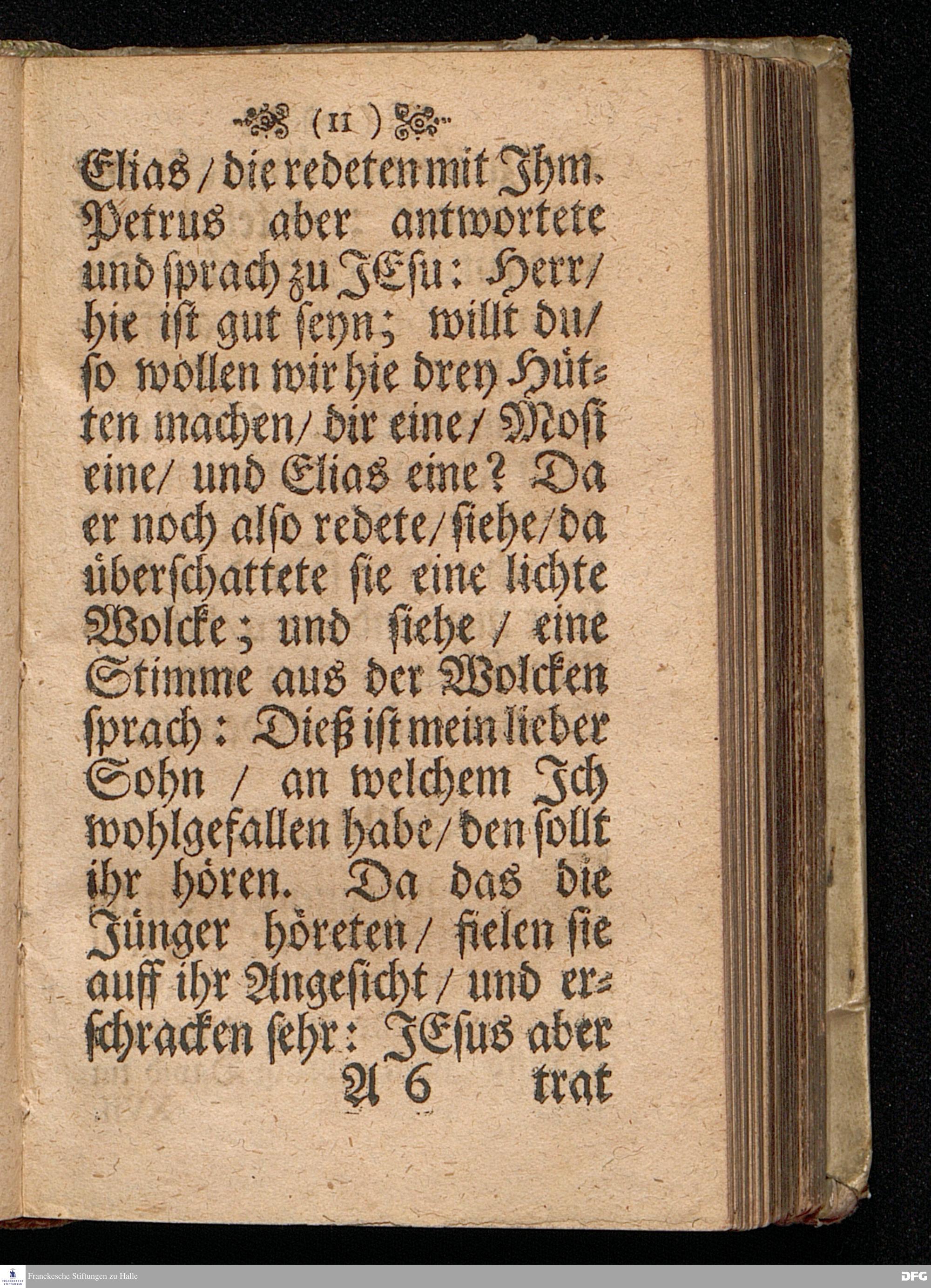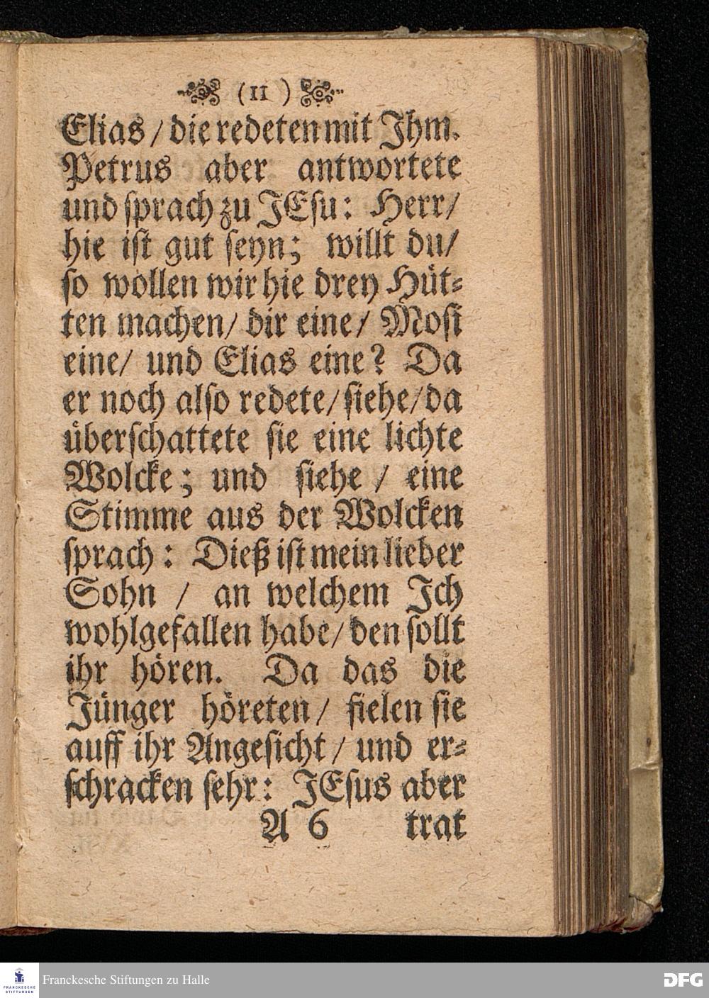 Der Vorschmack des ewigen Lebens / In einer Predigt Uber das Evangelium Matth.XVII, v.1==9, am 6.Sonntag nach Epiphan. Anno 1698, In der St.Georgen=Kirche zu Glaucha an Halle vorgestellet von M.August Hermann Francken / Gr.& OO.LL.P.P.& P.Glauch. HALLE / Gedruckt bey Christian Henckel / Univers.Buchdr.1698.
